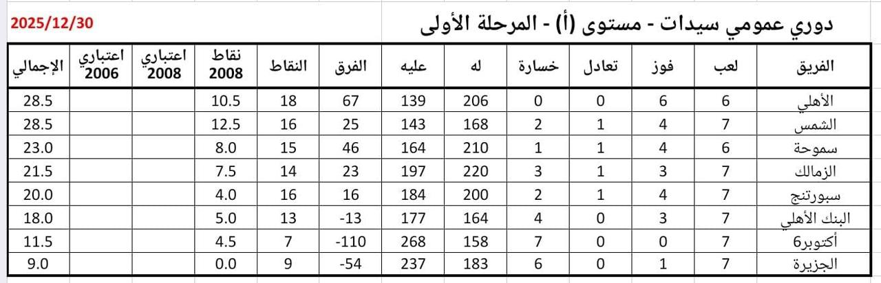 بينما جاء فريق الشمس في المركز الثاني برصيد 16 نقطة بعد الخسارة من الأهلي في الجولة السابعة بنتيجة 19-17 ، و من بعده سموحة برصيد15 نقطة ثم الزمالك رابعا برصيد 14 نقطة في ظل الخسارة من سموحة 33-28 ،وفاز فريق سيدات كرة اليد بالنادي الأهلي على سبورتنج بنتيجة 29-24 فى الجولة السادسة بدوري العمومي لسيدات كرة اليد للموسم المحلي 2025-2026، بينما فاز الزمالك على البنك الأهلى بنتيجة 25-24.
