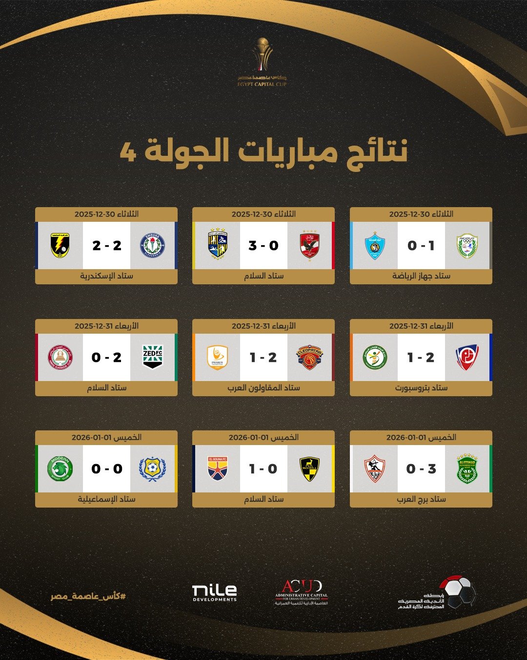 وشهد ترتيب مجموعات كأس عاصمة مصر بنهاية الجولة الرابعة غياب واضح لقطبى الكرة المصرية الاهلى والزمالك وكذلك بيراميدز وتزعم فاركو والمصري البورسعيدى والجونة صدارة المجموعات الثلاث.تضم النسخة الحالية من بطولة كأس عاصمة مصر 21 فريقاً تم تقسيمها على 3 مجموعات، كل مجموعة بها 7 أندية، على رأسها الأهلى والزمالك وبيراميدز.