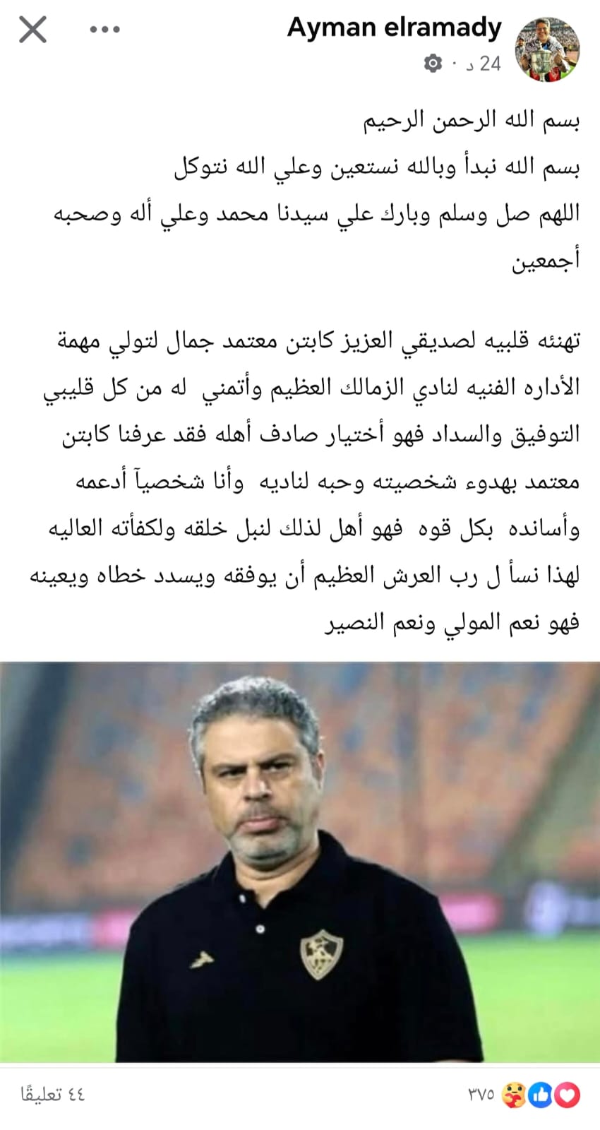 وكتب أيمن الرمادي عبر حسابه الشخصي على فيس بوك: بسم الله الرحمن الرحيم، بسم الله نبدأ وبالله نستعين وعلى الله نتوكل، اللهم صل وسلم وبارك على سيدنا محمد وعلى آله وصحبه أجمعين، تهنئة قلبية لصديقي العزيز كابتن معتمد جمال لتولي مهمة الإدارة الفنية لنادي الزمالك العظيم وأتمني له من كل قلبي التوفيق والسداد، فهو اختيار صادف أهله، فقد عرفنا كابتن معتمد بهدوء شخصيته وحبه لناديه، وأنا شخصيا أدعمه وأسانده بكل قوة فهو أهل لذلك لنبل خلقه ولكفاءته العالية.. لهذا نسأل رب العرش العظيم أن يوفقه ويسدد خطاه ويعينه فهو نعم المولي ونعم النصير.