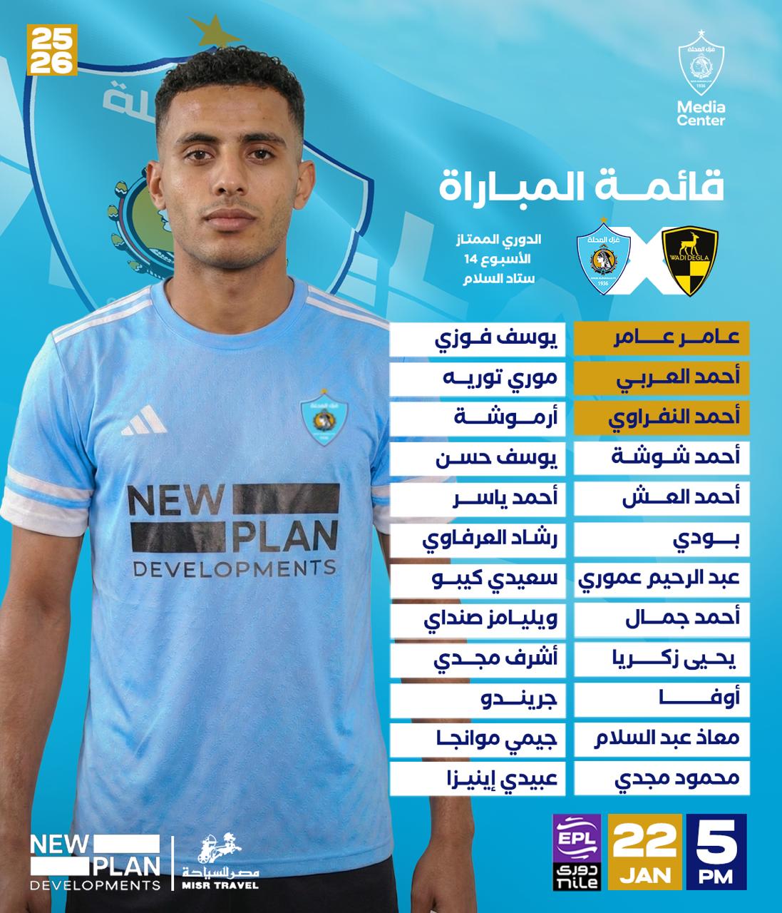 ويغيب محمود نبيل لاعب خط وسط الفريق المعار من نادى زد بسبب الرؤية الفنية للجهاز الفنى بينما عاطف الحكيم بسبب وفاة والده.
