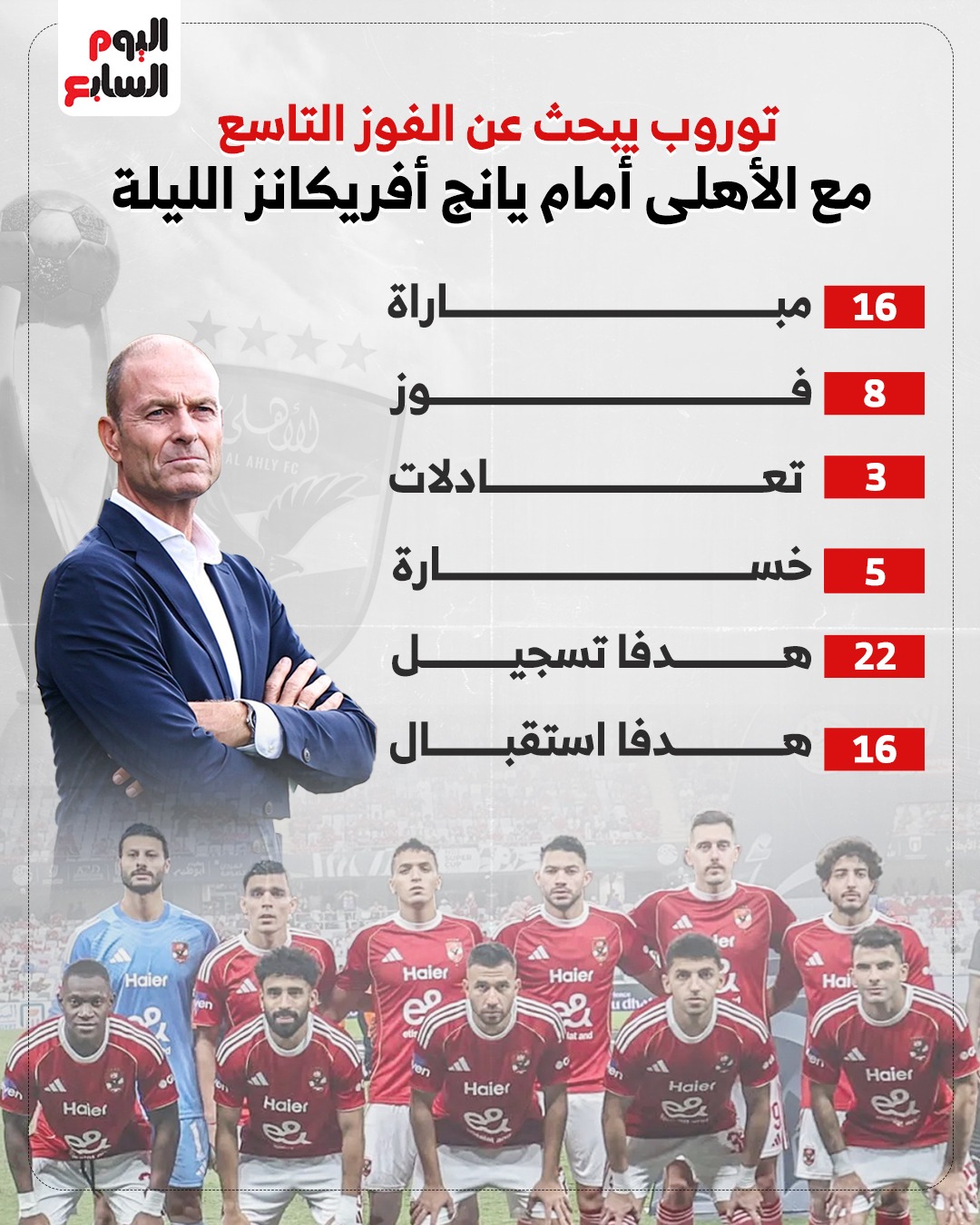 وتعد هذه المباراة رقم 17 للدنماركي ياس توروب المدير الفني للنادي الأهلي، منذ توليه القيادة الفنية للفريق، في أكتوبر من العام الماضي 2025. وخلال 16 مباراة سابقة، خاضها الفريق الأول لكرة القدم بالنادي الأهلي تحت قيادة توروب ، نجح الأهلى فى تحقيق الفوز في 8 مباريات، وتلقى الهزيمة فى 5 لقاءات، وحضر التعادل فى 3 مباريات. وسجل لاعبو النادي الأهلي، تحت قيادة توروب، 22 هدفا، فيما تلقت شباك الأحمر 16 هدفا.