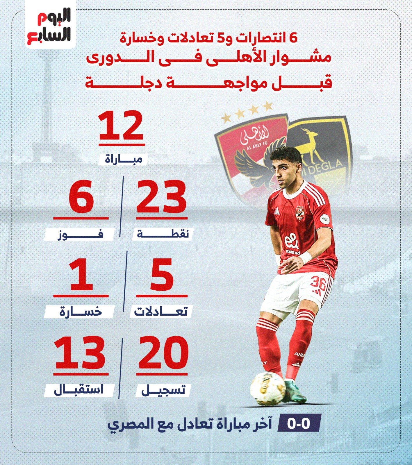 وخاض الأهلى 12 مباراة في الدوري جمع خلالها 23 نقطة، بعدما حقق الفوز في 6 مباريات، وتعادل في 5 مواجهات، بينما خسر مواجهة واحدة وسجل لاعبيه 20 هدف وتلقت شباكه 13 هدف.