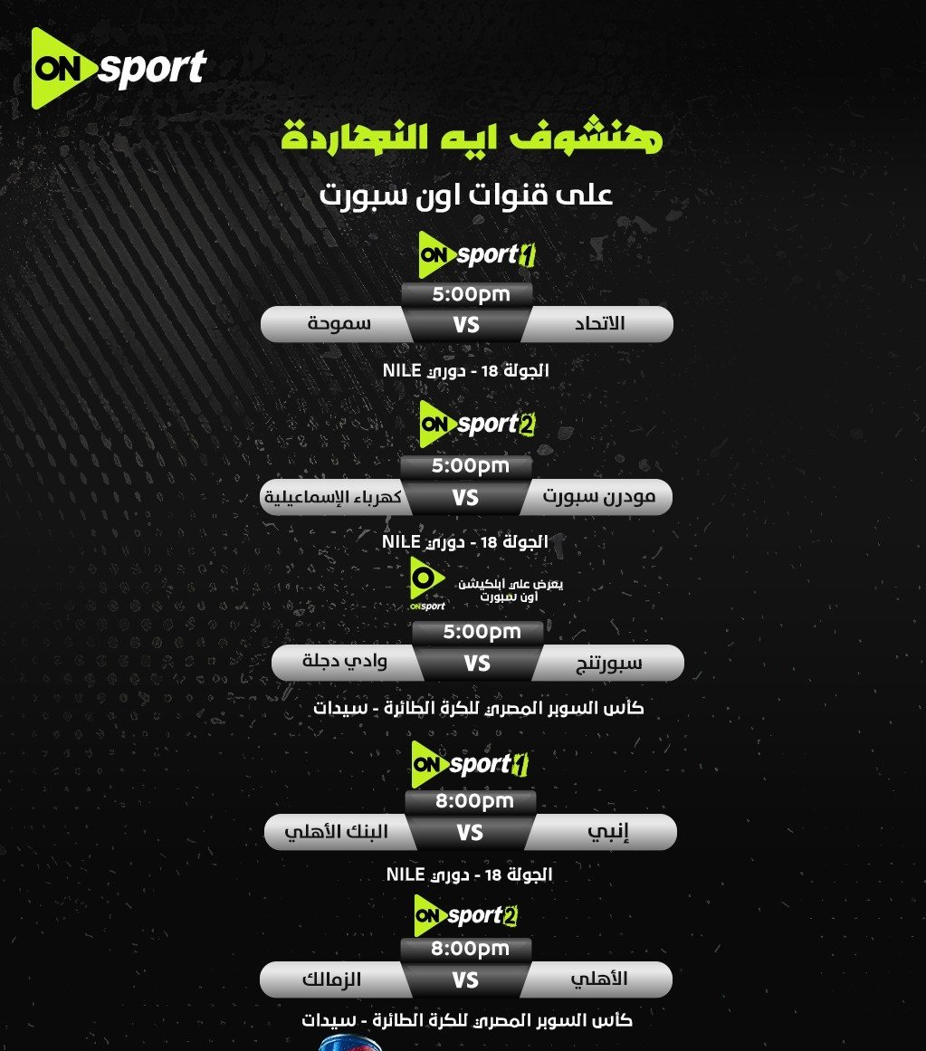5:00 مودرن سبورت - كهرباء الاسماعيلية 8:00 إنبي - البنك الأهلي