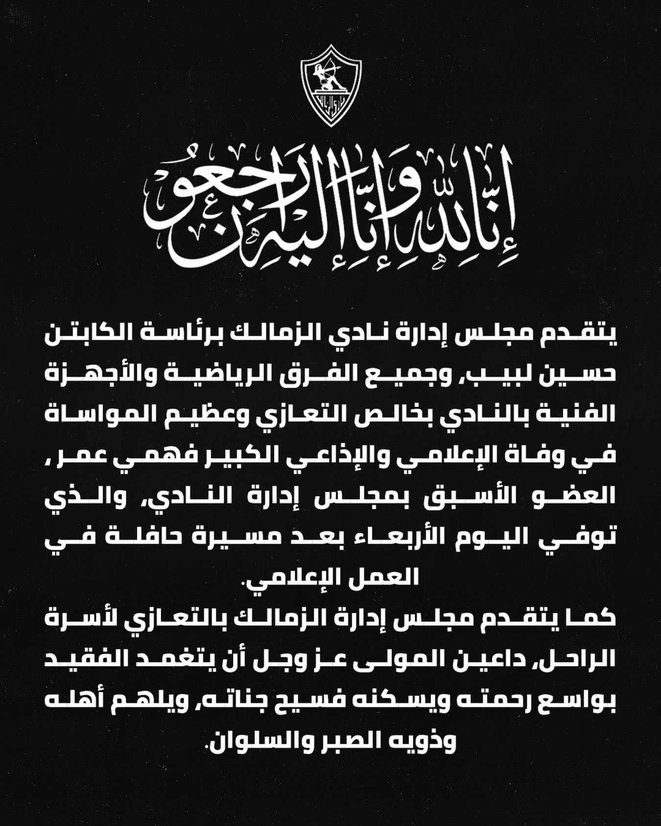 ببالغ الأسي والحزن نعى نادي الزمالك، الإذاعي القدير الأستاذ فهمي عمر رئيس الإذاعة المصرية الأسبق وشيخ الإذاعيين، الذي قدم على مدار عقود من العمل بالإذاعة، إعلاماً مهنياً متميزاً قدم خلالها برامج عديدة، تركت بصمة لا تنسى كما كان عضوا سابقا فى مجلس إدارة نادي الزمالك.