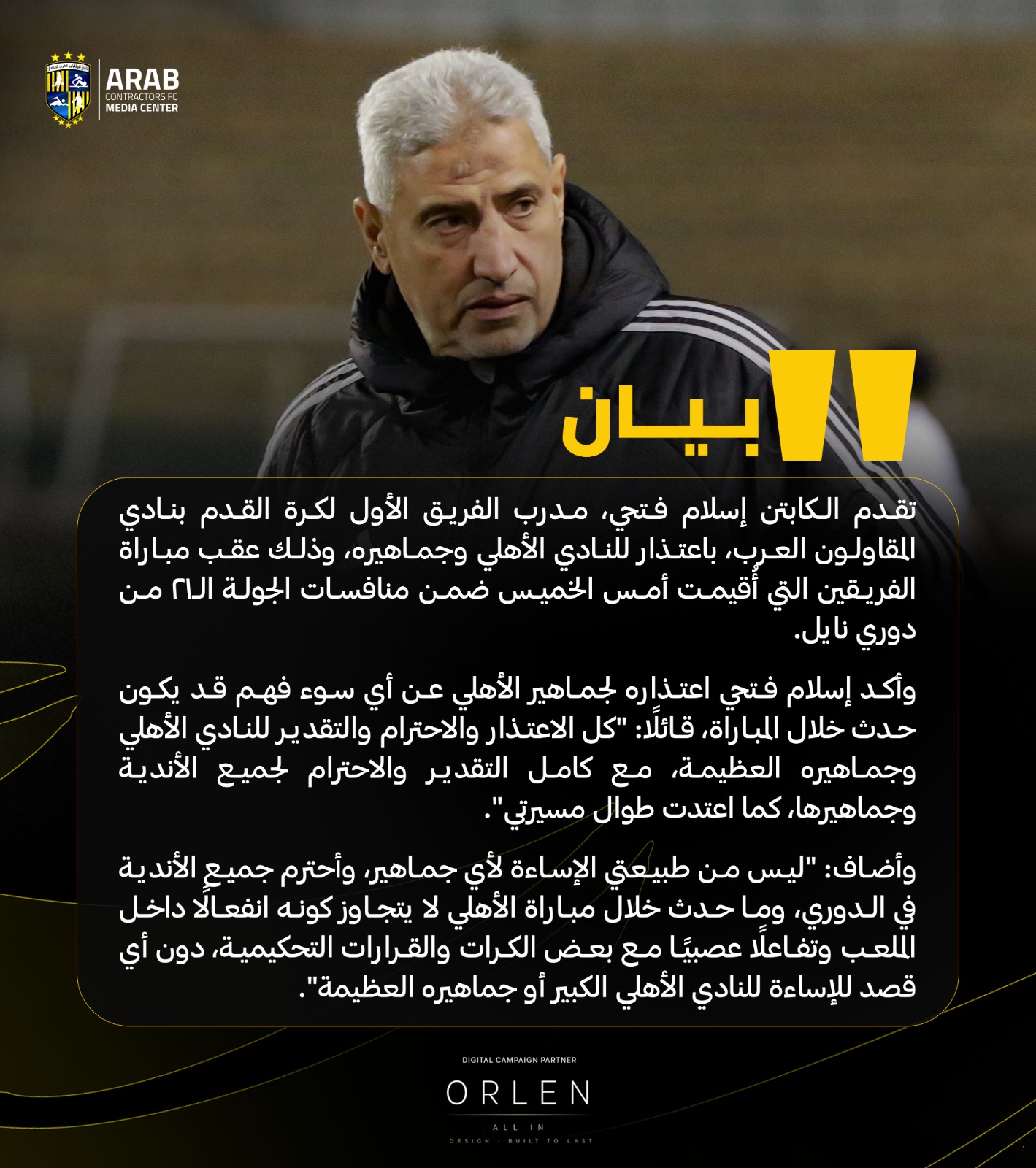 تقدم إسلام فتحي مدرب الفريق الأول لكرة القدم ب نادي المقاولون العرب باعتذار للنادي الأهلي وجماهيره عقب مباراة الفريقين التي أقيمت أمس الخميس في الجولة 21 للدوري الممتاز .