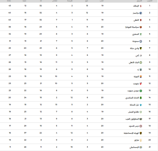 شهد جدول ترتيب الدورى المصرى ، عقب انتهاء الأسبوع الـ21 من عمر المسابقة تصدر الزمالك الجدول برصيد 43 نقطة، ليتفوق على بيراميدز والأهلى صاحبىّ المركزين الثانى والثالث بنفس الرصيد 40 نقطة.