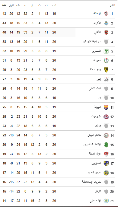 وجاء جدول ترتيب الدورى بعد مباريات اليوم كالتالي: