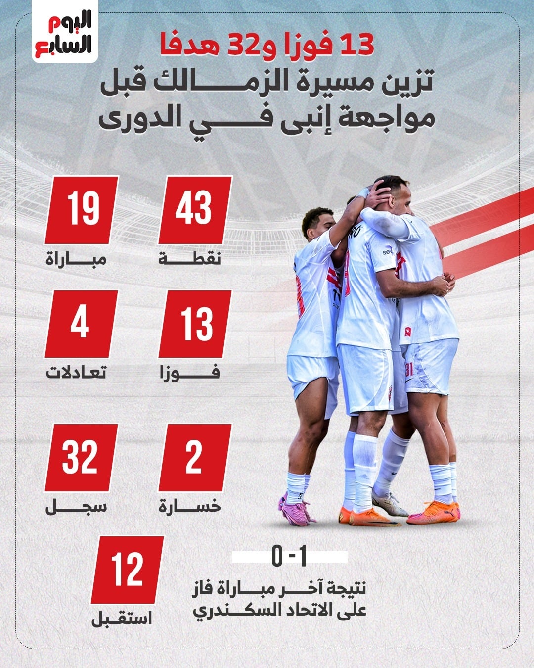 وحقق الفريق الأبيض 13 انتصارًا خلال مشواره في المسابقة، مقابل 4 تعادلات وتلقى هزيمتين فقط، وهو ما يعكس حالة الاستقرار الفني التي يعيشها الفريق خلال الموسم الحالي.