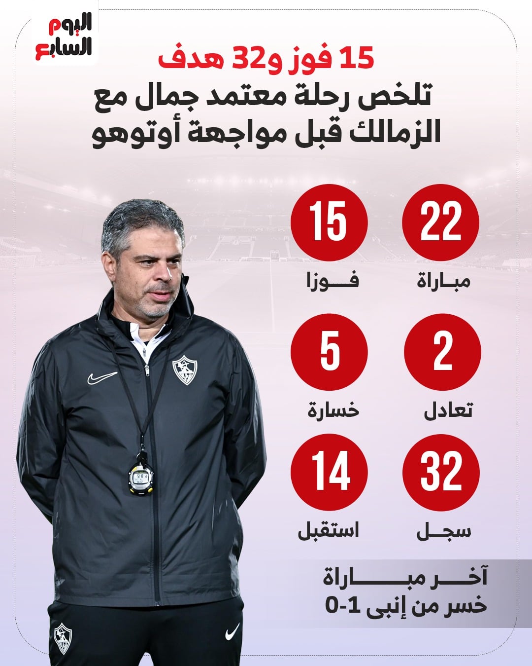 ويأتي أداء الزمالك تحت قيادة معتمد جمال هذا الموسم على النحو التالي: لعب 22 مباراة، فاز في 15 منها، وتعادل فى مباراتين، وتعرض للهزيمة فى 5 مباريات، وسجل الفريق 32 هدفًا، واستقبل 14.