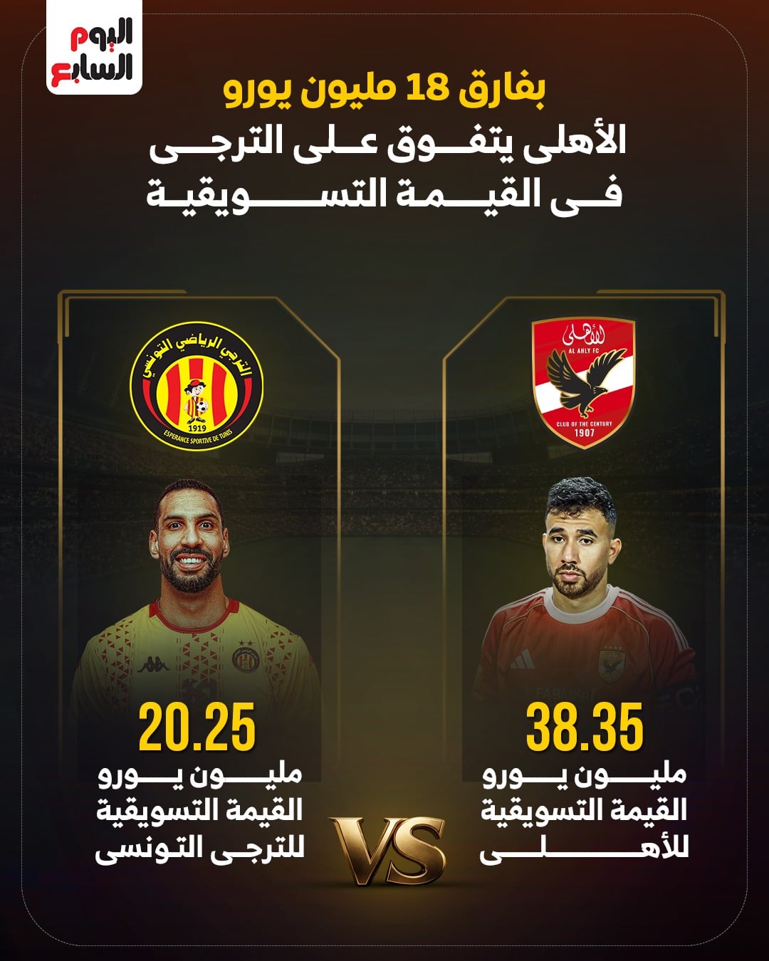 وتبلغ القيمة التسويقية للأهلى 38.35 مليون يورو، فيما تبلغ القيمة التسويقية للترجى التونسى 20.25 مليون يورو.