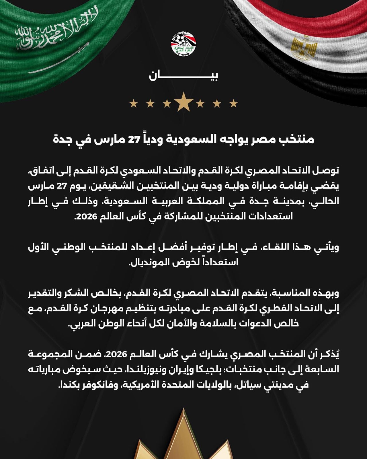 ويُذكر أن المنتخب المصري يشارك في كأس العالم 2026 ضمن المجموعة السابعة، إلى جانب منتخبات بلجيكا وإيران ونيوزيلندا، حيث سيخوض مبارياته في مدينتي سياتل بالولايات المتحدة الأمريكية وفانكوفر بكندا.