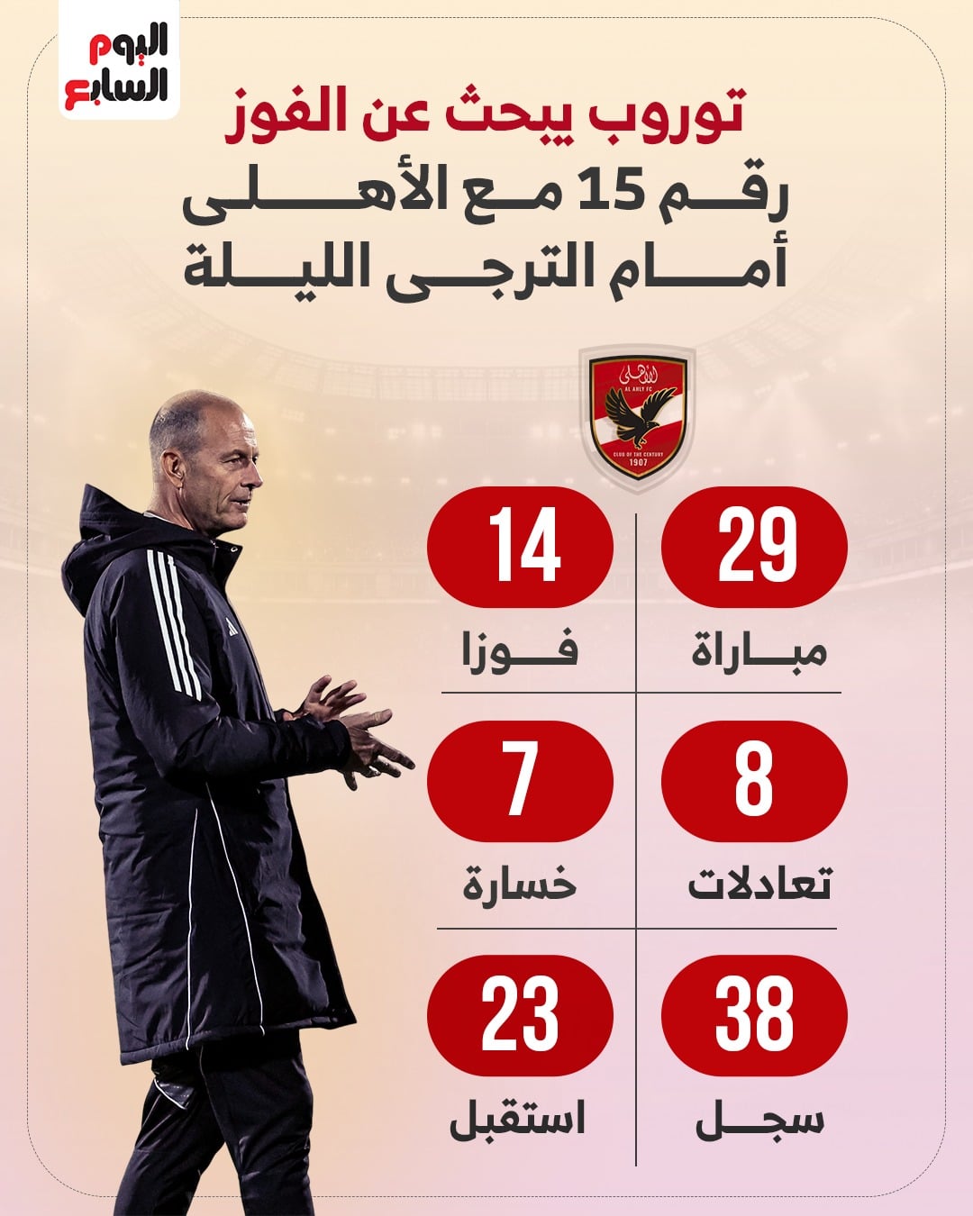 وتعد هذه المباراة رقم 30 للدنماركي ييس توروب المدير الفني للنادي الأهلي، منذ توليه القيادة الفنية للفريق في أكتوبر الماضي 2025، وخلال 29 مباراة سابقة، خاضها الفريق الأول لكرة القدم بالنادي الأهلي تحت قيادة توروب، نجح الأهلى فى تحقيق الفوز في 14 مباراة، وتلقى الهزيمة فى 7 لقاءات، وحضر التعادل فى 8 مباريات.