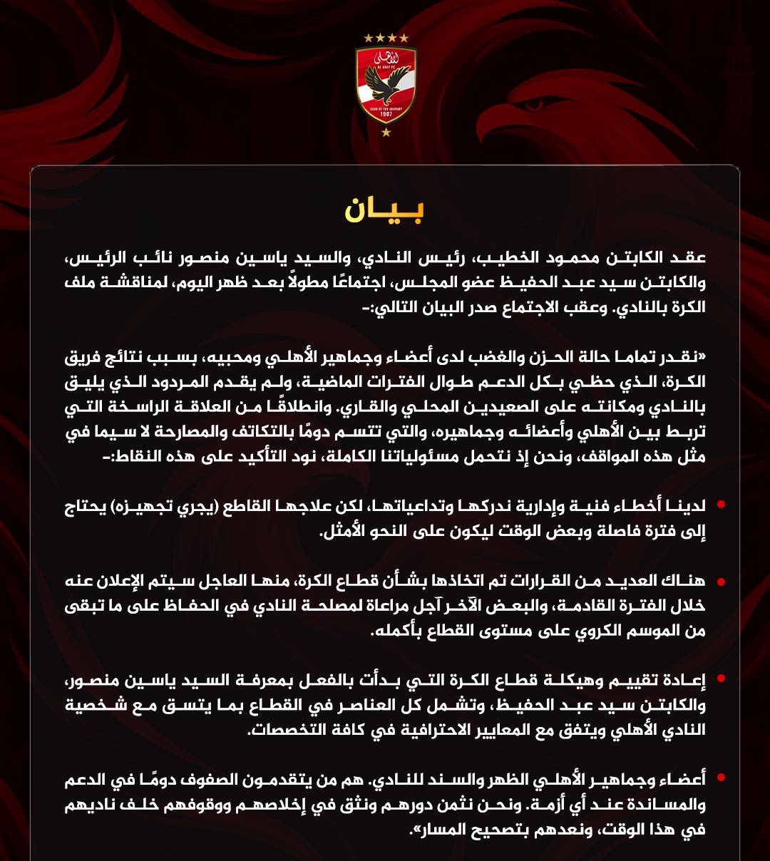 نقدر تماما حالة الحزن والغضب لدى أعضاء وجماهير الأهلي ومحبيه، بسبب نتائج فريق الكرة، الذي حظي بكل الدعم طوال الفترات الماضية، ولم يقدم المردود الذي يليق بالنادي ومكانته على الصعيدين المحلي والقاري. وانطلاقا من العلاقة الراسخة التي تربط بين الأهلي وأعضائه وجماهيره، والتي تتسم دومًا بالتكاتف والمصارحة لا سيما في مثل هذه المواقف، ونحن إذ نتحمل مسئولياتنا الكاملة، نود التأكيد على هذه النقاط:-