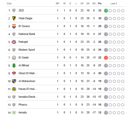 يتصدر فريق زد ترتيب مجموعة الهبوط في الدوري المصري الممتاز، فيما يأتي وادي دجلة في المركز الثاني والجونة في المركز الثالث، فيما يتواجد البنك الأهلي في المركز الرابع.