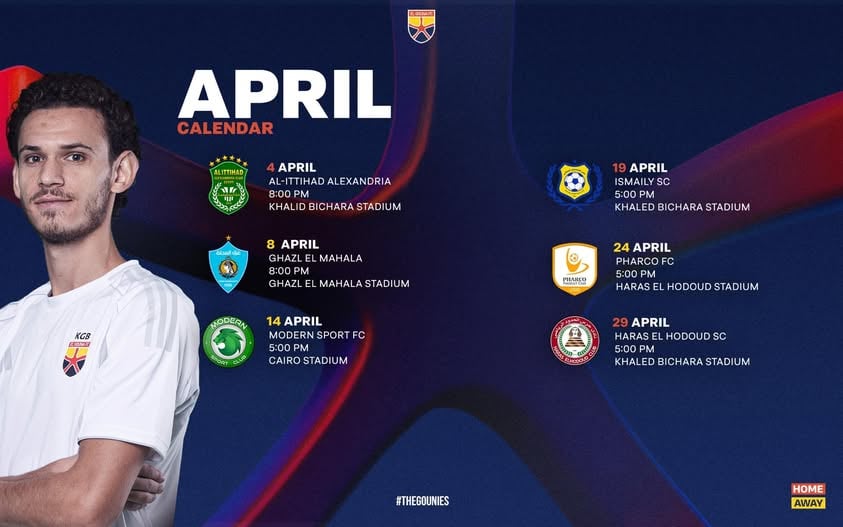 وفى التاسع عشر من أبريل يستضيف الجونة نظيره الإسماعيلى بإستاد خالد بشارة ، وفى الرابع والعشرين يخرج لمواجهة فاركو بإستاد المكس ، ويختتم مواجهاته بشهر أبريل بلقاء حرس الحدود بملعبه بالجونة .
