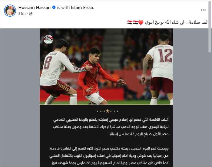 أثبتت الأشعة التي خضع لها إسلام عيسى لاعب منتخب مصر ، إصابته بقطع بالرباط الصليبي الأمامي للركبة اليسري ، وذلك عقب توجه اللاعب مباشرة لإجراء الأشعة فور وصول بعثة منتخب مصر الأول صباح اليوم قادمة من إسبانيا.