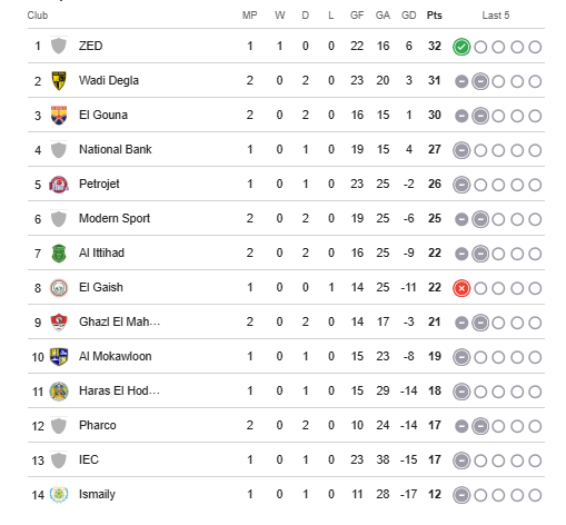 ويتصدر فريق زد ترتيب مجموعة الهبوط في الدوري المصري ثم يحل وادي دجلة في المركز الثاني والجونة في المركز الثالث، ويأتي من بعدهم البنك الأهلي في المركز الرابع.