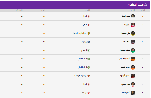 تقاسم الثنائى الفلسطينى عدى الدباغ مهاجم فريق الزمالك ومحمود حسن "تريزيجيه" جناح فريق الأهلى صدارة جدول هدافى بطولة الدورى المصرى الممتاز برصيد 8 أهداف لكل منهما عقب إقامة اليوم الأحد الموافق 5 – 4 – 2026 ثلاث مباريات من عمر البطولة، حيث التقى البنك الأهلى مع حرس الحدود وواجه الإسماعيلى فريق طلائع الجيش، وفى الختام استضاف المصرى البورسعيدى نظيره الزمالك.