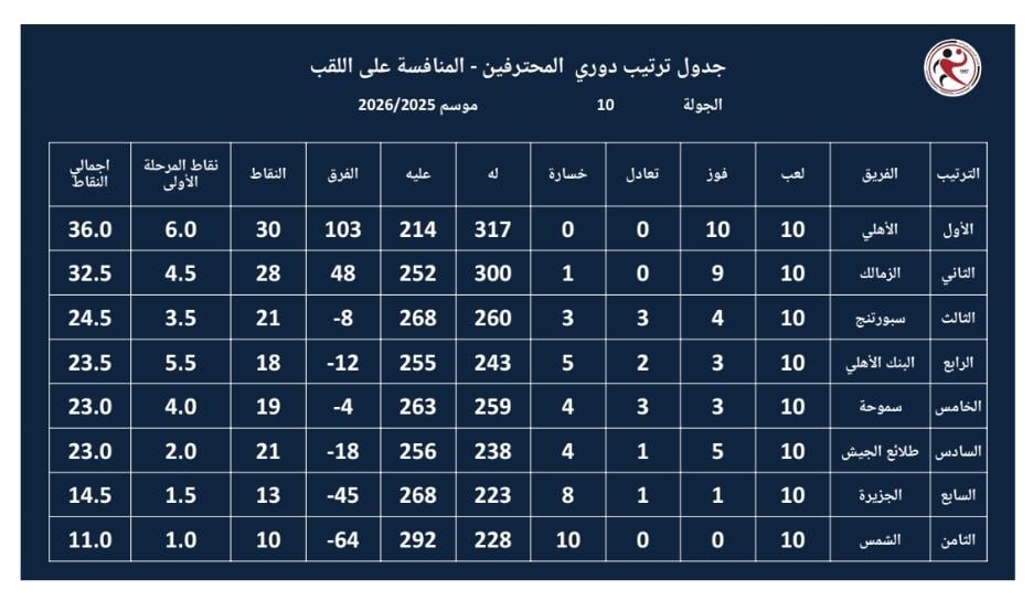 يواصل فريق رجال كرة اليد بالنادى الأهلي تصدر ترتيب دورى المحترفين للرجال لكرة اليد للموسم المحلي 2025-2026 برصيد 36 نقطة بعد انتهاء الجولة العاشرة.