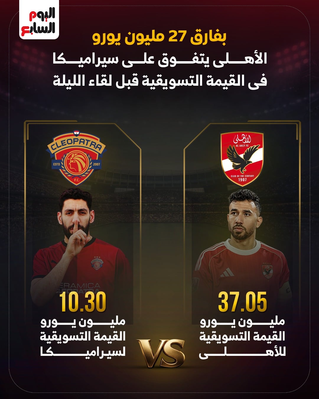 تبلغ القيمة التسويقية لفريق الأهلى 37.05 مليون يورو، فيما تبلغ القيمة التسويقية لفريق سيراميكا 10.30 مليون يورو