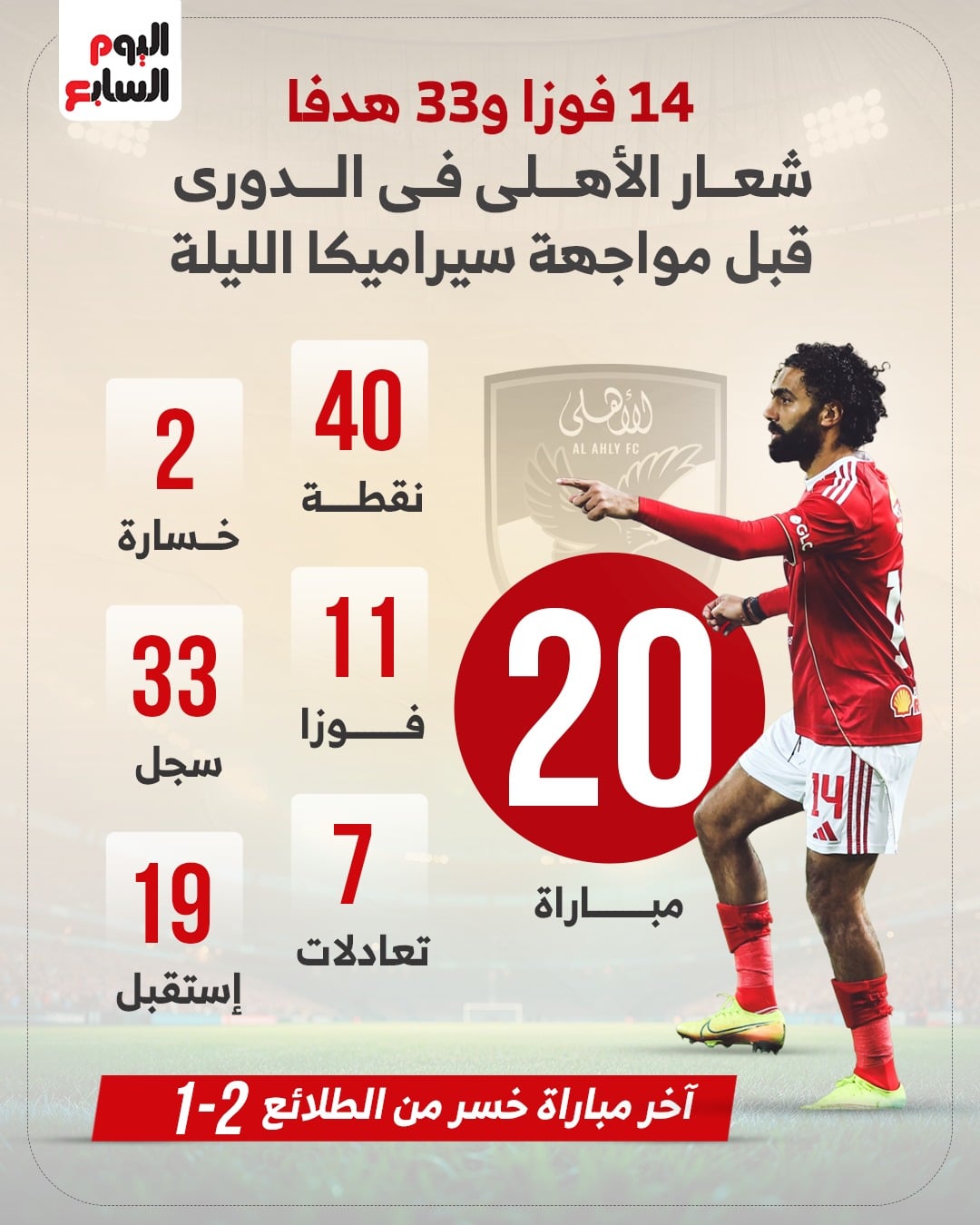 14 فوزا و 33 هدفا شعار الأهلى في الدوري قبل مواجهة سيراميكا الليلة.. إنفو جراف