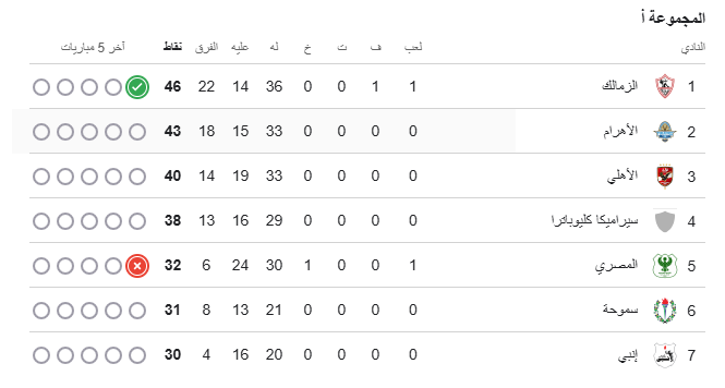 تختتم اليوم الثلاثاء، منافسات الجولة الأولى من مجموعة التتويج، ويتربع نادي الزمالك على صدارة جدول ترتيب الدوري برصيد 46 نقطة، وذلك بعد الفوز الكبير الذي حققه على النادي المصري البورسعيدى فى الجولة الأولى من منافسات مجموعة التتويج بالبطولة، برباعية مقابل هدف.