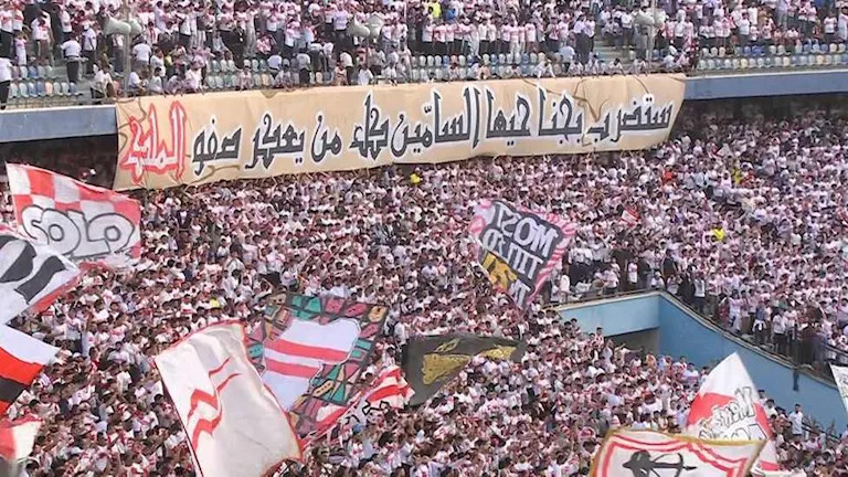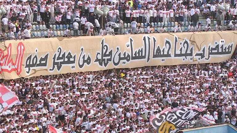 ورفعت جماهير الزمالك المتواجدة في المدرجات، لافتة كتب عليها: "ستضرب بجناحيها السامين، كل من يعكر صفو الملك".