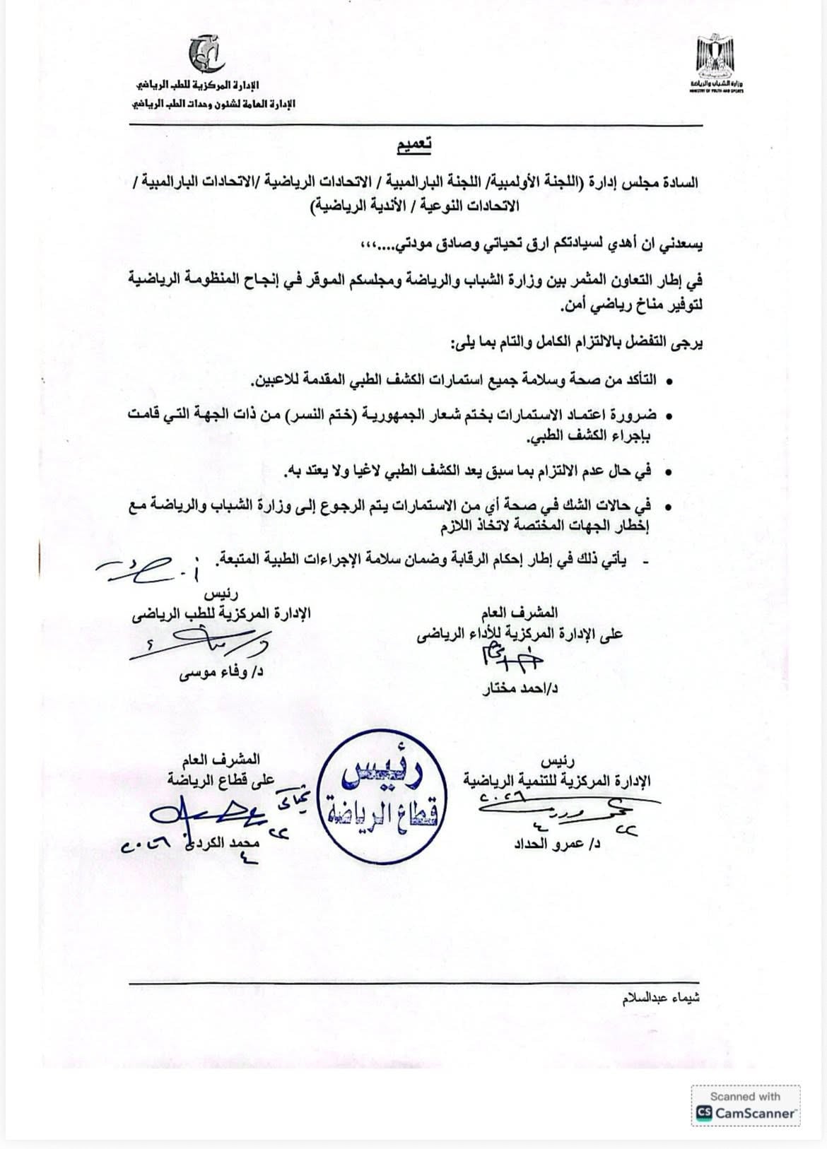 وكانت و زارة الشباب والرياضة أصدرت تعميمًا رسميًا شددت خلاله على ضرورة الالتزام الكامل بالإجراءات الطبية الخاصة باللاعبين في مختلف الاتحادات والأندية، لضمان سلامة الرياضيين وتوفير بيئة آمنة للمنافسات.