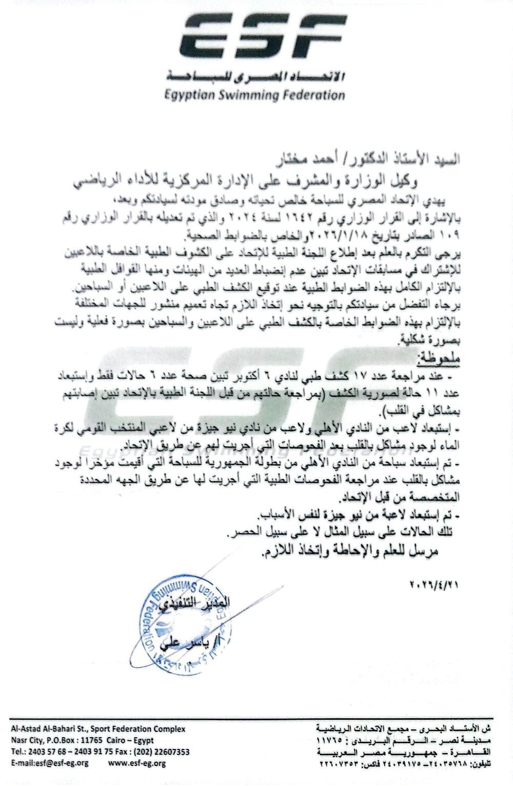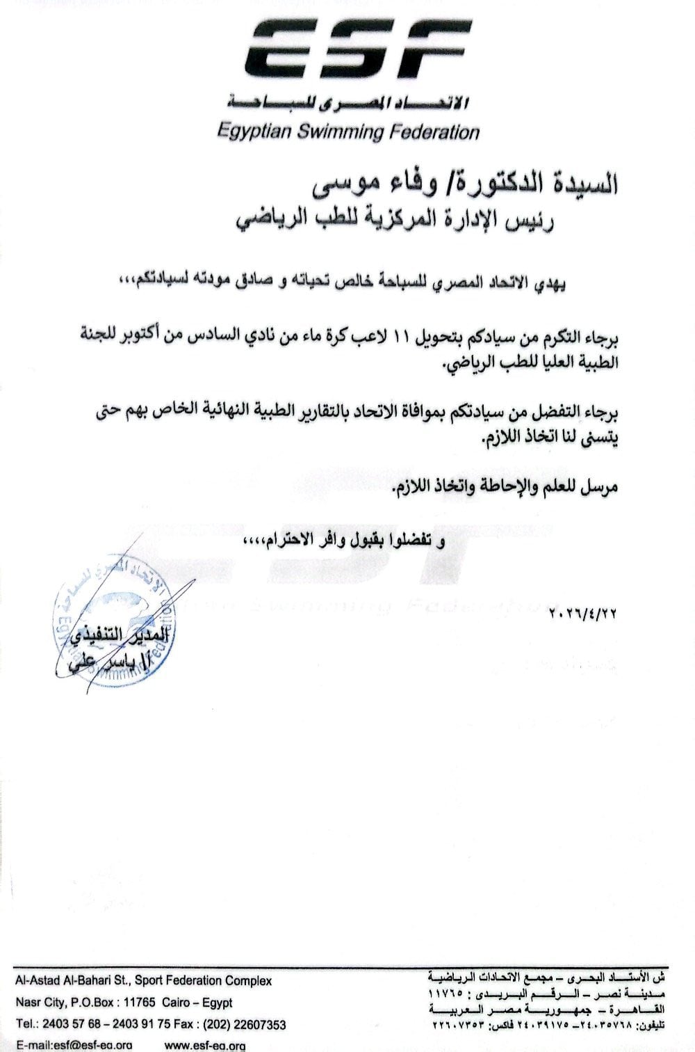 خاطب الاتحاد المصري للسباحة الجهات المعنية، مطالبًا بتحويل عدد من لاعبي كرة الماء إلى اللجنة الطبية العليا، واستيفاء الموافقات الخاصة بالتقارير الطبية النهائية لهم.