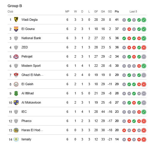 يحتل حرس الحدود المركز الثالث عشر وقبل الأخير برصيد 20 نقطة، بينما يتربع وادي دجلة على القمة برصيد 38 نقطة