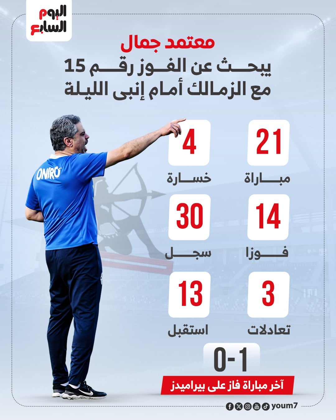 معتمد جمال يبحث عن الفوز رقم 15 مع الزمالك أمام إنبى الليلة.. إنفوجراف
