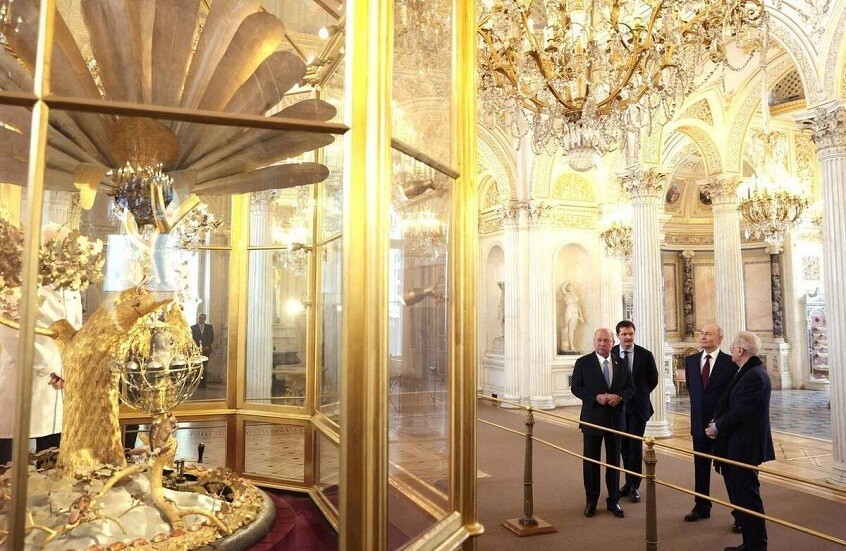 وقام الرئيس بوتين وضيفه بجولة في قاعة الجناح في متحف الإرميتاج، الذي يجمع بين الزخارف القديمة وزخارف عصر النهضة والزخارف الشرقية، ويضم نوافير رخامية وفسيفساء بتصاميم رومانية قديمة.