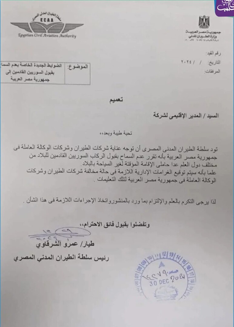 وانتشر على صفحات وسائل التواصل الاجتماعي، ومصادر تعميم متداول يفيد بصدور قرار يمنع دخول المواطنين السوريين الحاصلين على موافقات دخول إلى جمهورية مصر العربية.