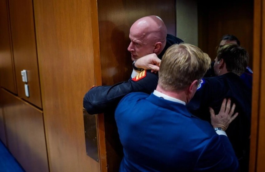 ضباط وسيناتور أمريكي خلال محاولتهم إخراج الناشط برايان ماكغينيس بالقوة من جلسة جلسة استماع في الكونغرس الأمريكي. / Gettyimages.ru