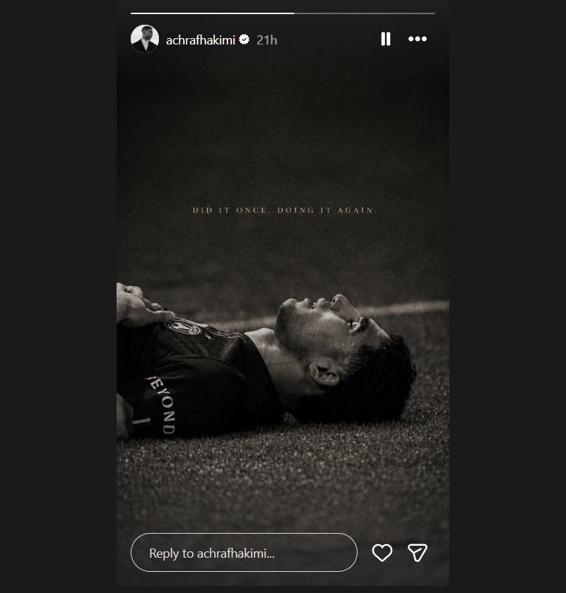 وجاءت رسالة حكيمي بعد ساعات قليلة من صدور بيان رسمي لنادي باريس سان جيرمان، الذي أكد أن الفحوصات الدقيقة بالرنين المغناطيسي أظهرت إصابة اللاعب على مستوى الفخذ الأيمن، مما يستوجب خضوعه لفترة علاج وتأهيل تمتد لعدة أسابيع، وبالتالي غيابه المؤكد عن مباراة الإياب المرتقبة أمام بايرن ميونخ في نصف نهائي دوري أبطال أوروبا، والمقرر إقامتها الأربعاء المقبل على ملعب "أليانز أرينا" بميونخ.