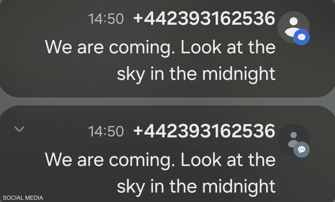 وتضمنت الرسالة تهديدا باللغة الإنجليزية جاء فيه: "نحن قادمون، انظروا إلى السماء عند منتصف الليل"، في تلميح يُعتقد أنه يحاكي سيناريوهات هجمات صاروخية مشابهة لتلك التي وقعت خلال "حرب الأيام الـ12" مع إيران.