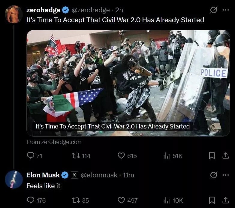 جاءت تصريحات ماسك عبر تعليق على منشور في منصة "إكس"، حيث وصف كاتب المنشور المواجهة الدائرة بين الإدارة الأمريكية الحالية والقوى الليبرالية بـ"الحرب الأهلية 2.0"، خاصة في ظل الاحتجاجات المتصاعدة ضد إجراءات شرطة الهجرة. وعلّق ماسك قائلا: "يبدو أن الأمر كذلك".