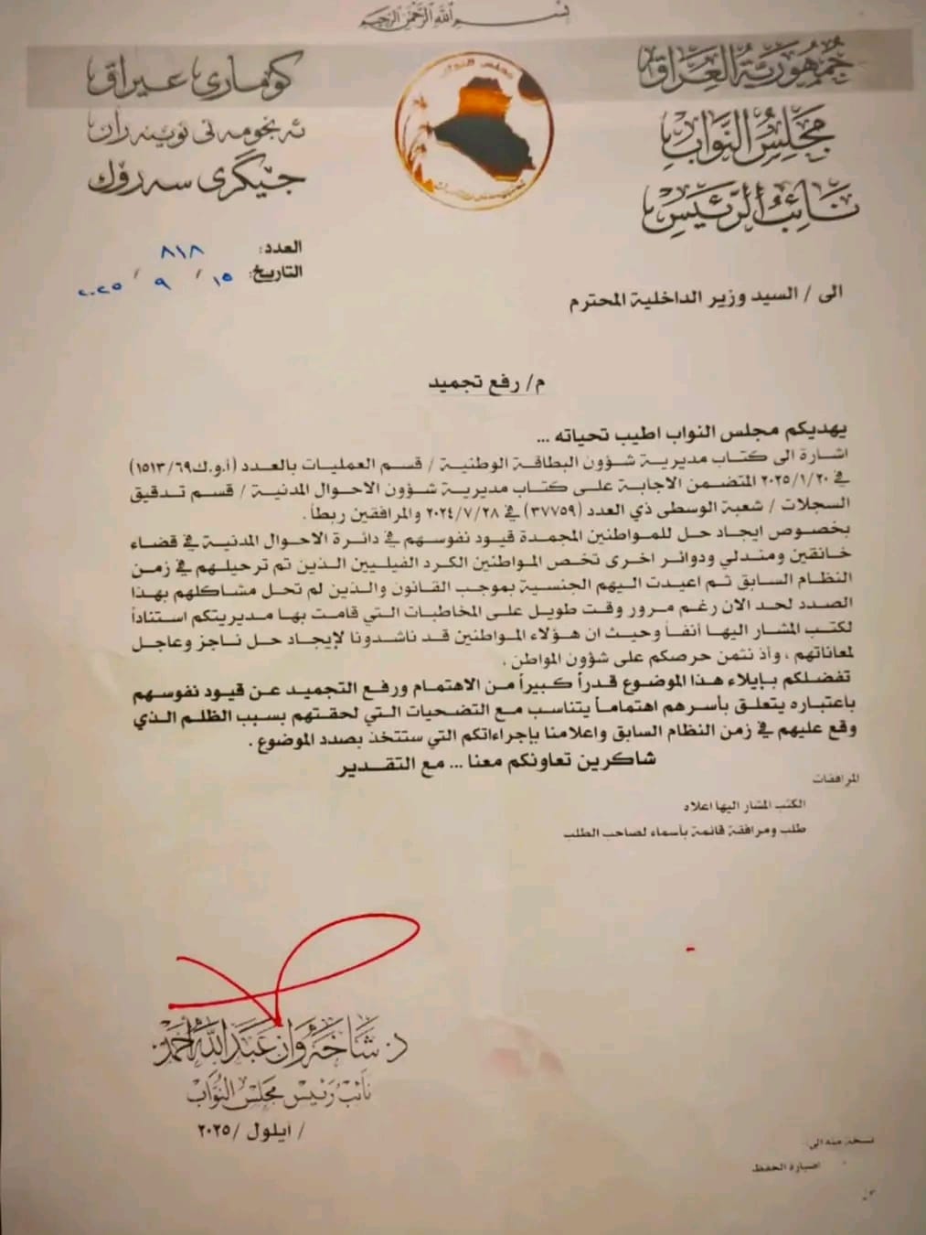 خاطب مجلس النواب العراقية، يوم الأربعاء، وزير الداخلية الاتحادي لمعالجة قضية تجميد قيود نفوس الأحوال المدنية للكورد الفيليين.