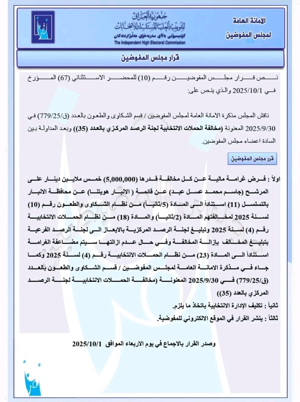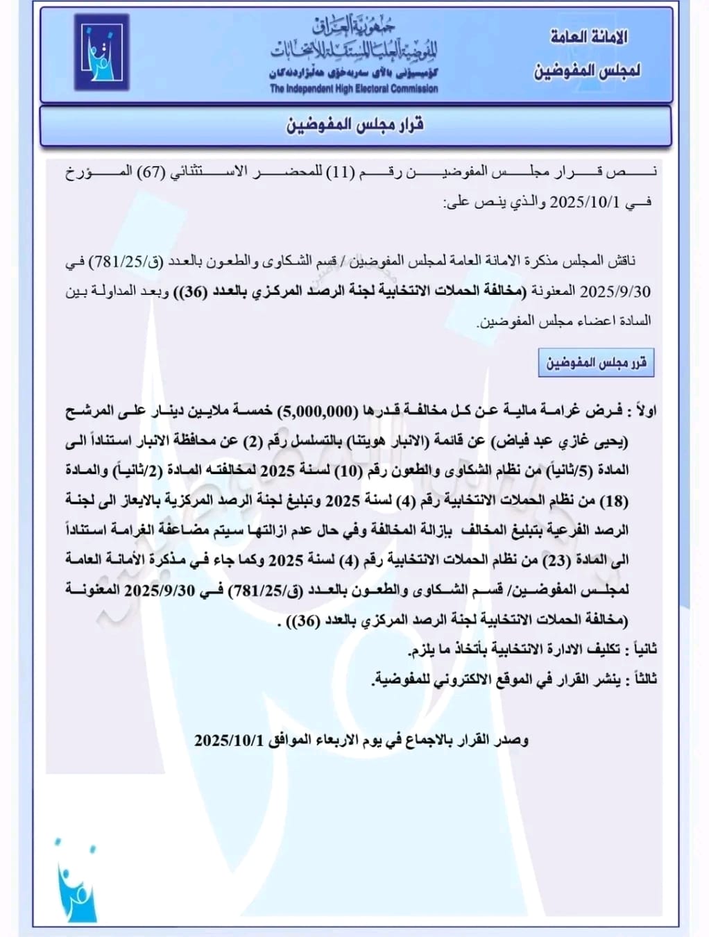قررت المفوضية العليا المستقلة للانتخابات، يوم الأربعاء، فرض غرامة مالية على مرشحين اثنين عن قائمة "الأنبار هويتنا" لمخالفتهما ضوابط الحملات الانتخابية.