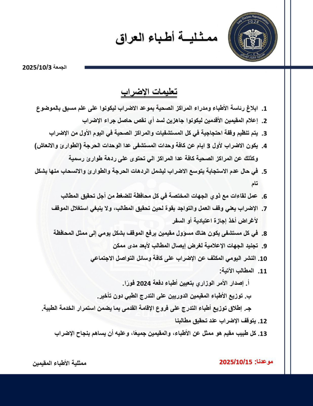 كما أشارت إلى أن يكون "في كل مستشفى مسؤول مقيمين يرفع الموقف بشكل يومي إلى ممثل المحافظة مع تجنيد الجهات الإعلامية لغرض إيصال المطالب لأبعد مدى ممكن"، مشددة على ضرورة "النشر اليومي المكثف عن الإضراب على كافة وسائل التواصل الاجتماعي لتحقيق المطالب ".