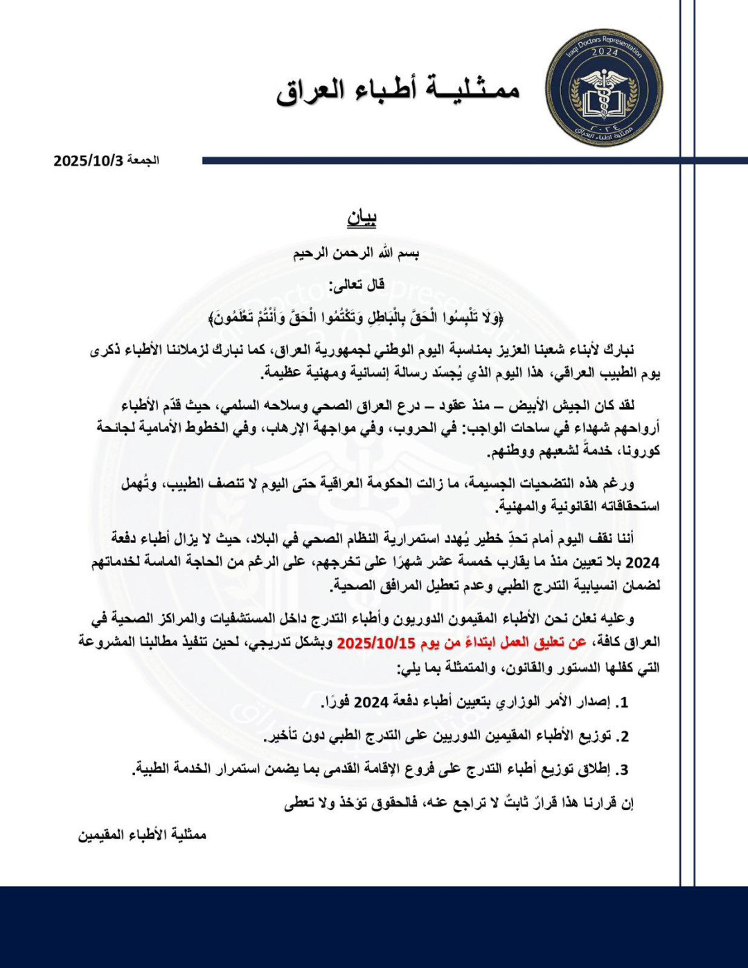 أعلنت ممثلية الأطباء المقيمين، مساء الجمعة، تعليق عمل جميع الأطباء المقيمين الدوريين وأطباء التدرّج داخل المستشفيات والمراكز الصحية في العراق كافة لحين تنفيذ ثلاثة مطالب حددتها الممثلية .
