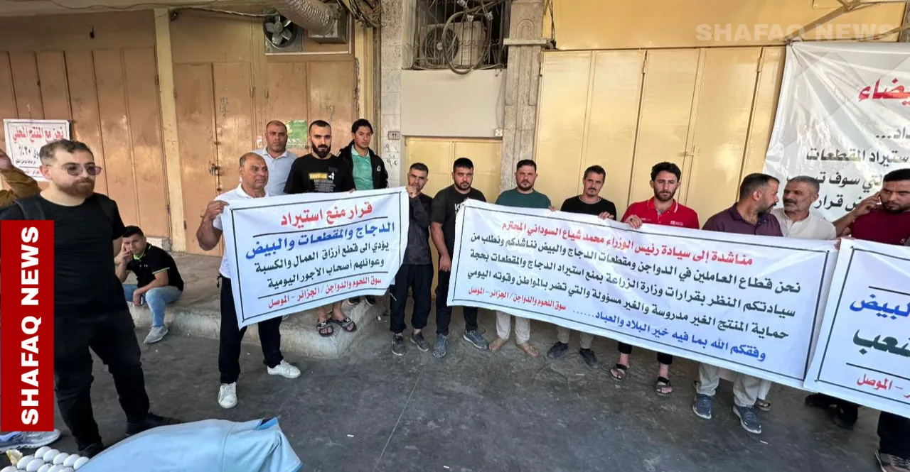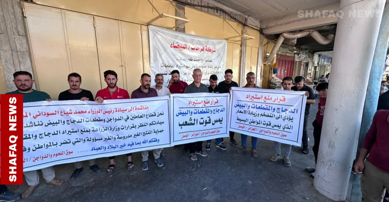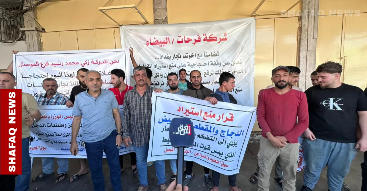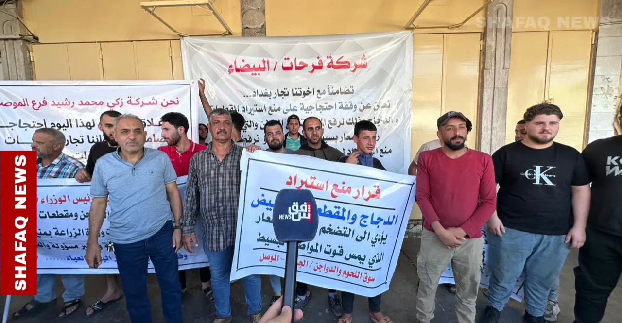 نظّم عشرات التجار في مدينة الموصل، يوم الأحد، وقفة احتجاجية في حي الجزائر بالجانب الأيسر، رفضاً لقرار وزارة الزراعة القاضي بمنع استيراد اللحوم إلى العراق.