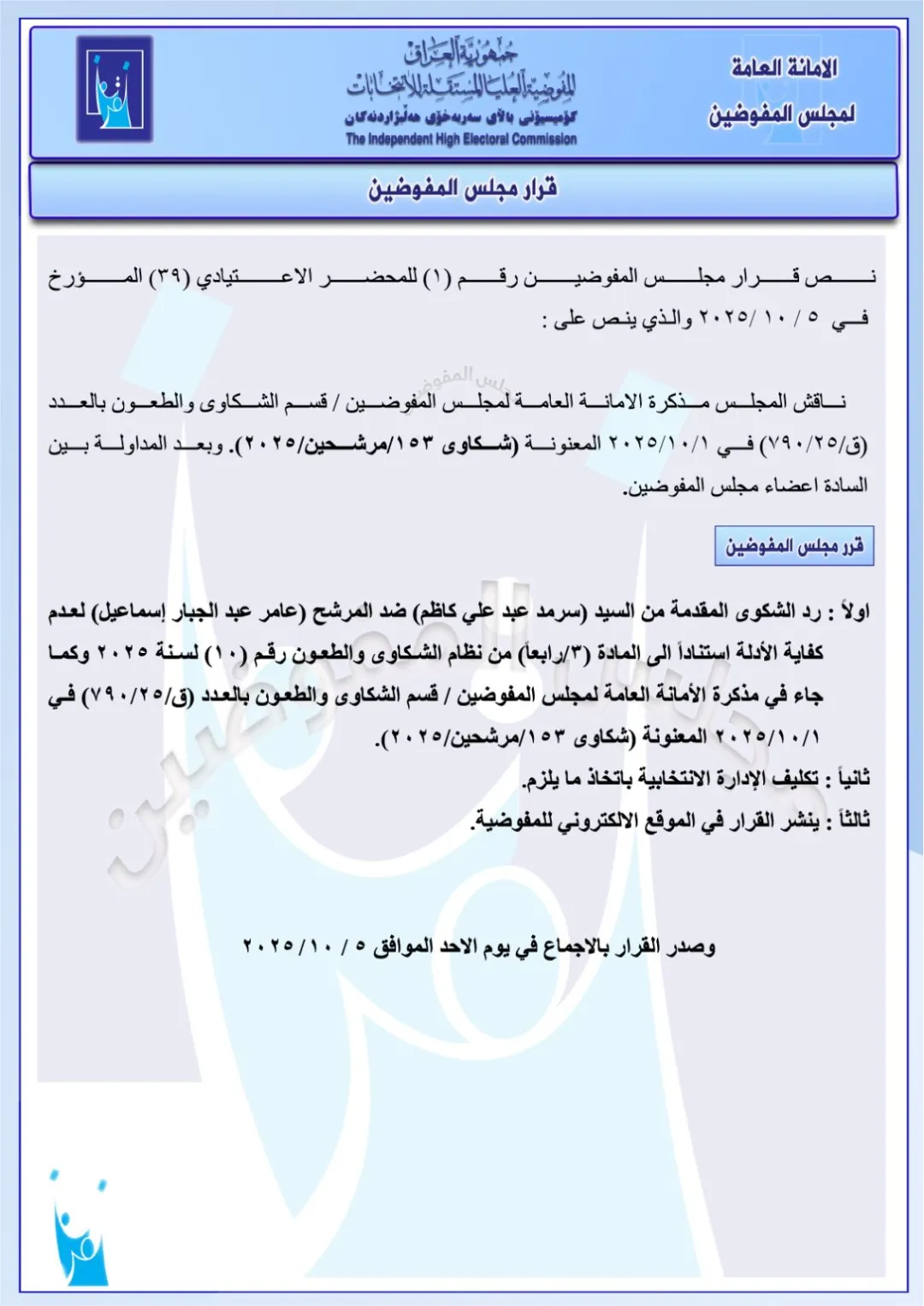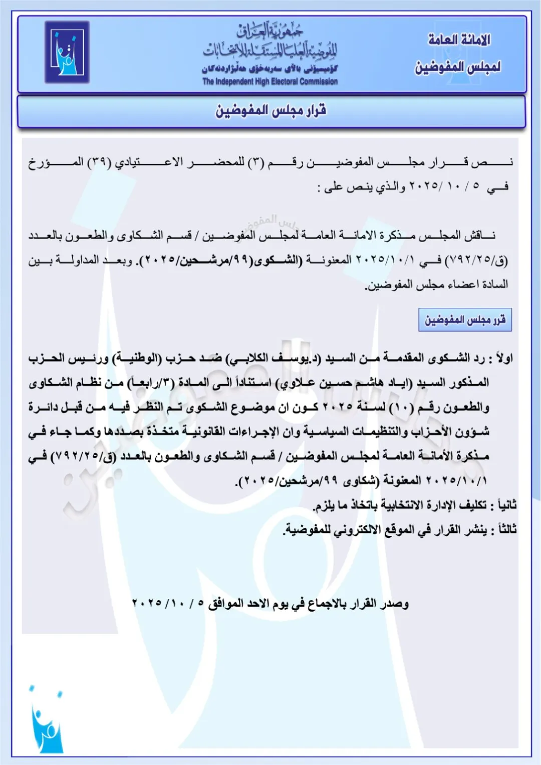 أعلنت مفوضية الانتخابات، يوم الأحد، رد شكوى قدّمها النائب عامر عبد الجبار ضد رئيس الوزراء محمد شياع السوداني، فضلاً عن رد شكاوى أخرى ضد مرشحين آخرين .