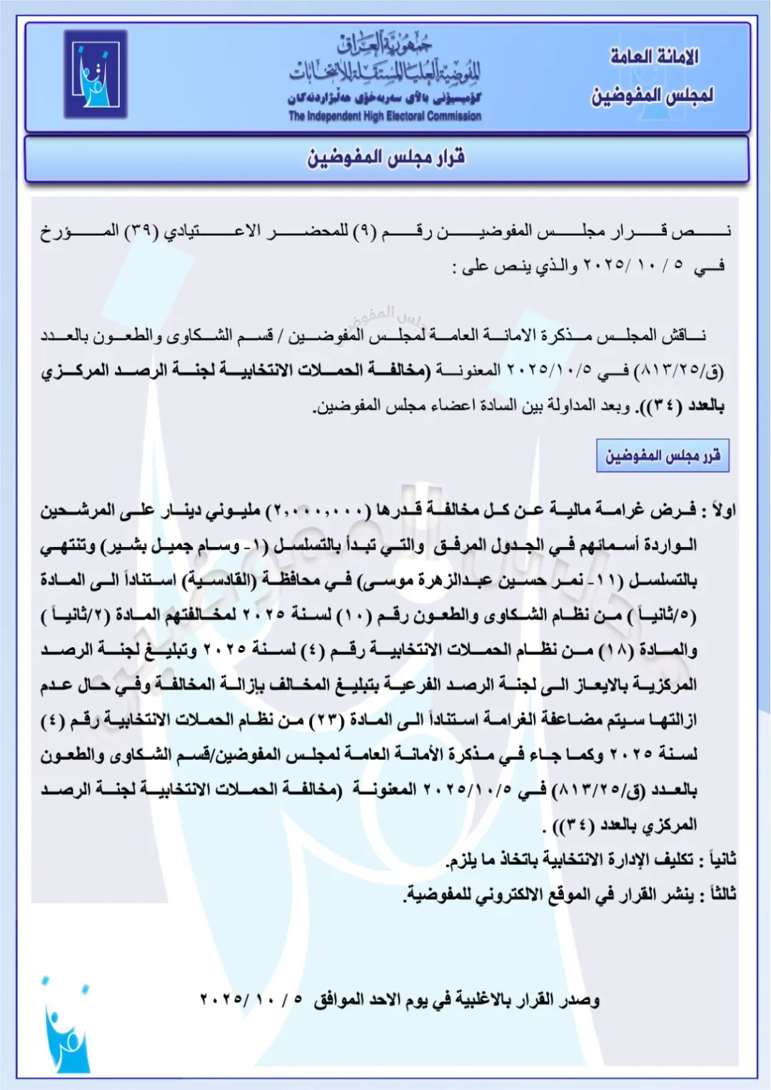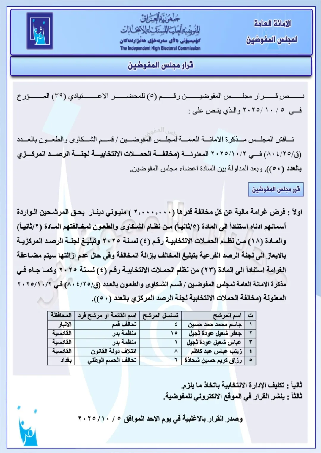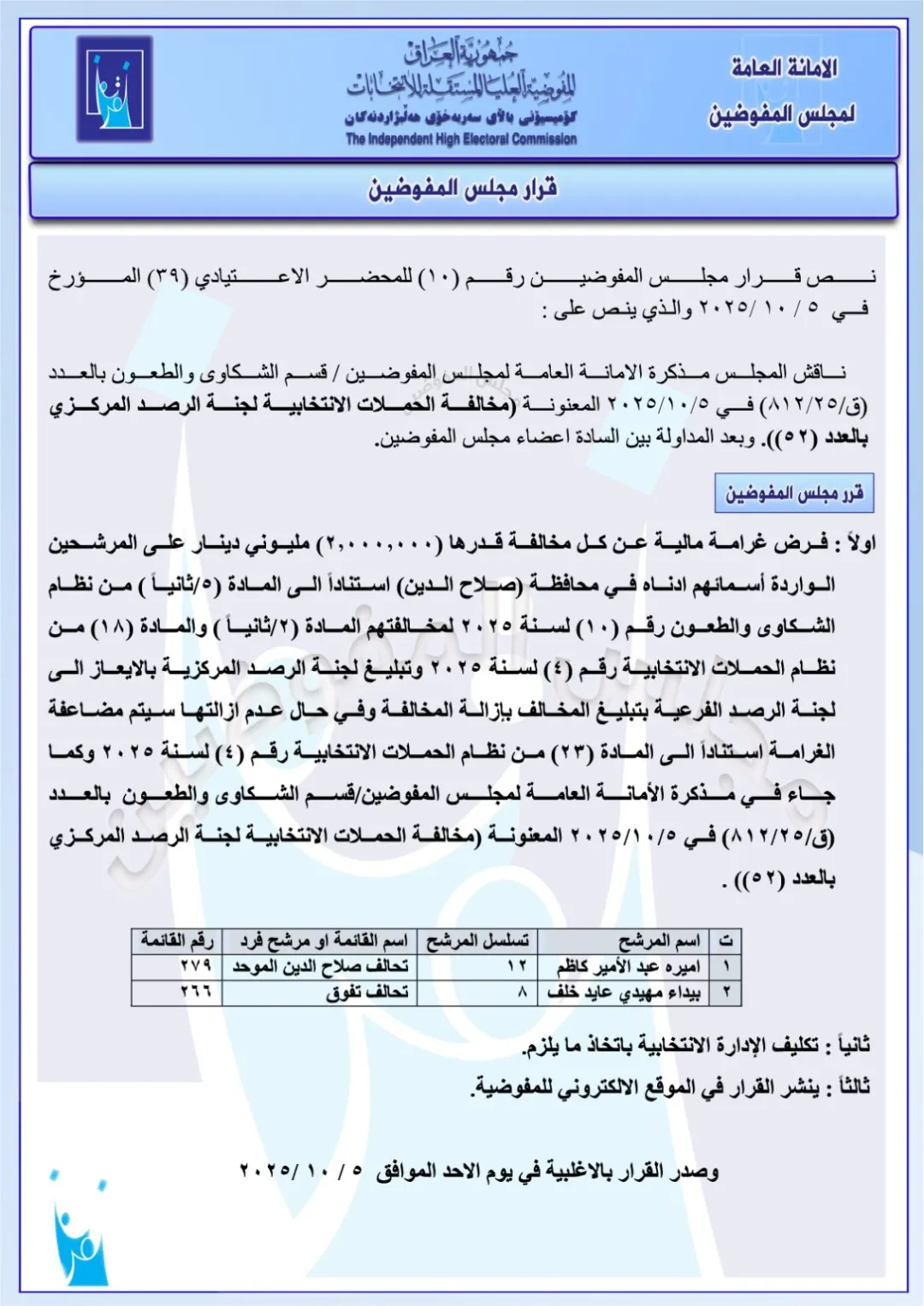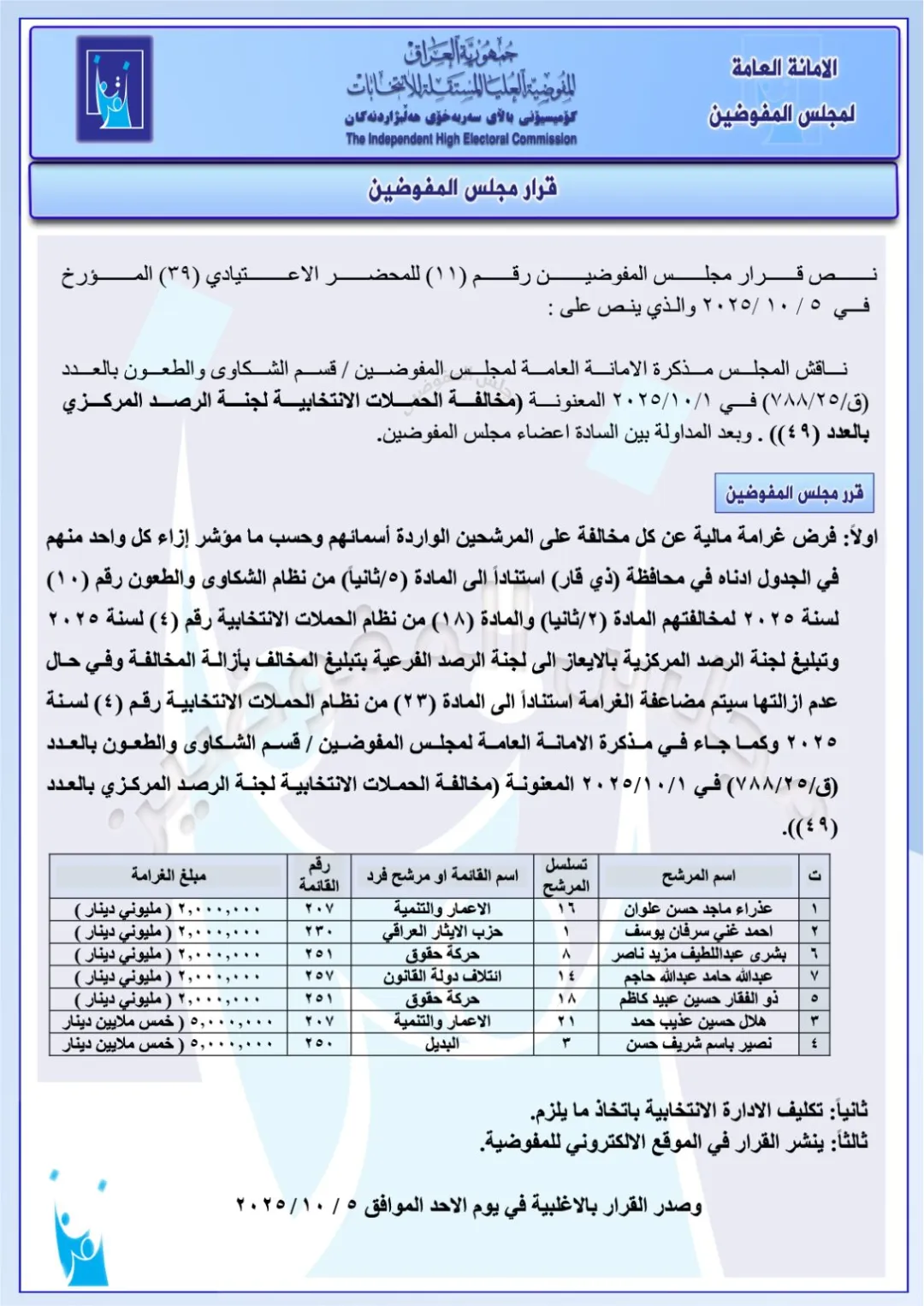 كما تضمنت الوثائق، فرض غرامات قدرها مليوني دينار عراقي، على مجموعة من قوائم المرشحين والأحزاب، لمخالفتهم نظام الحملات الانتخابية .
