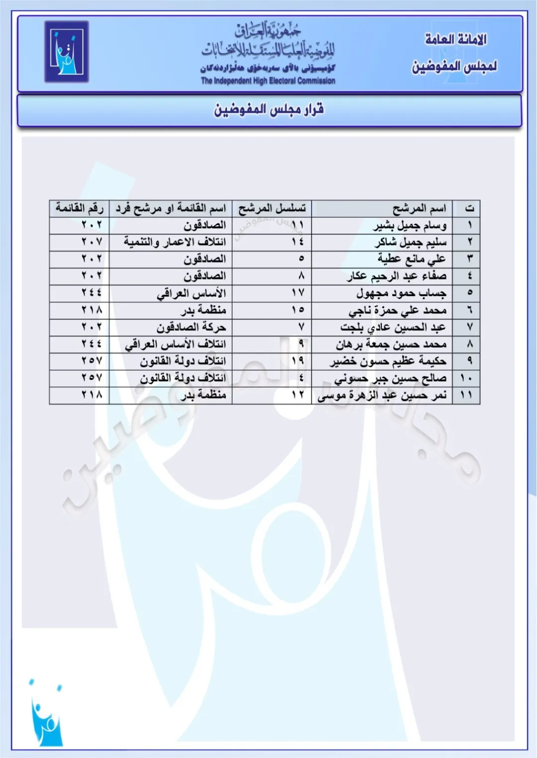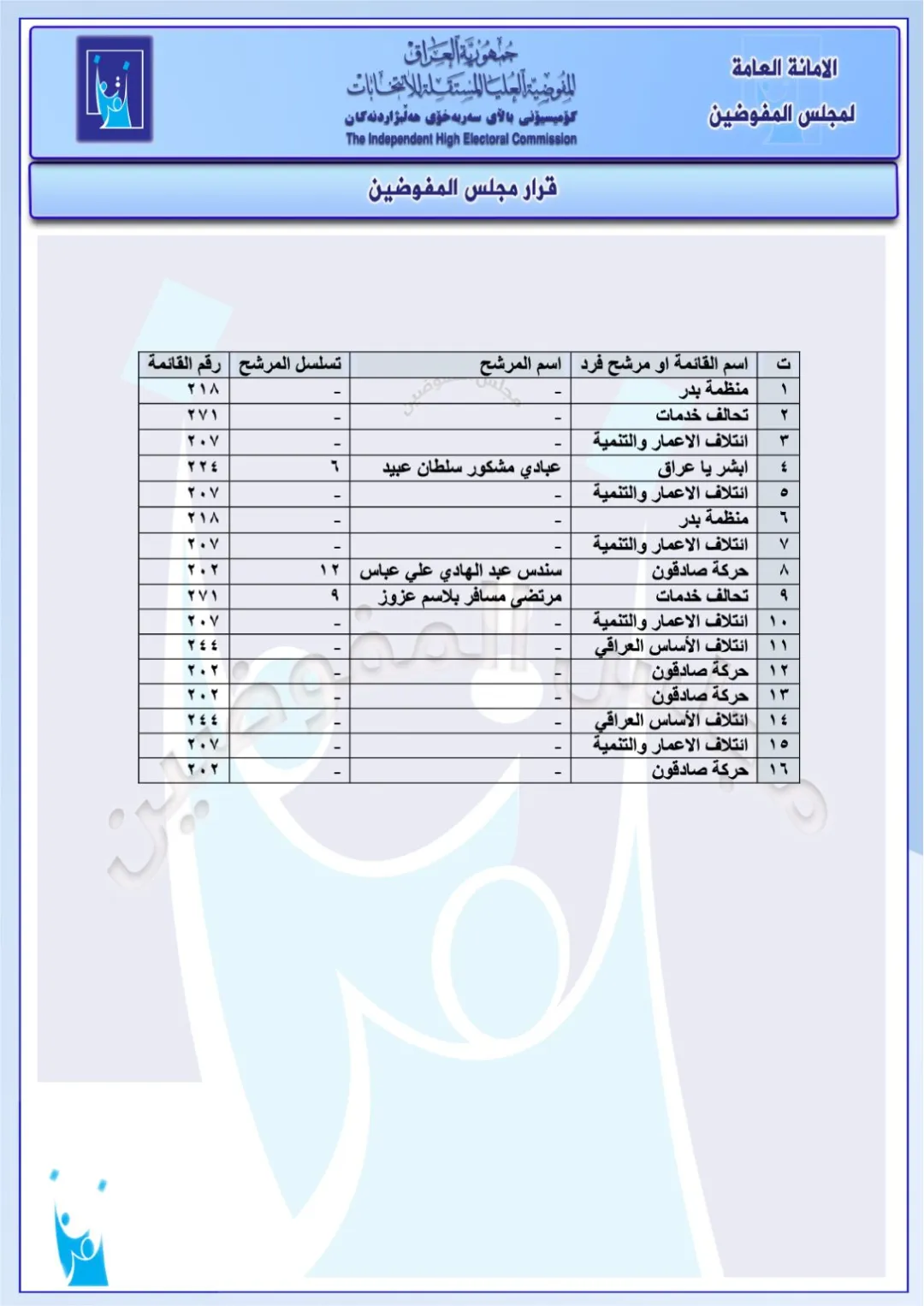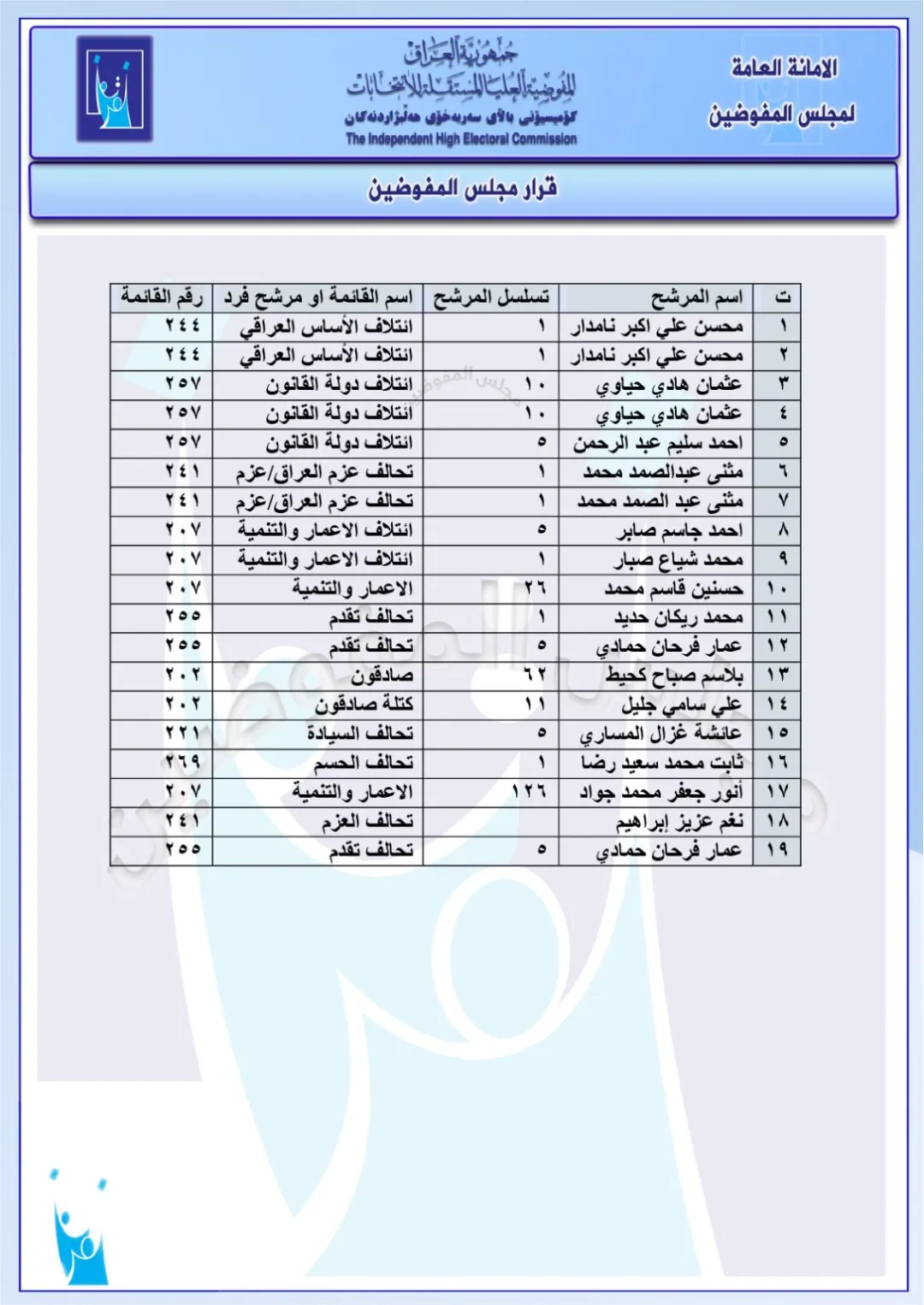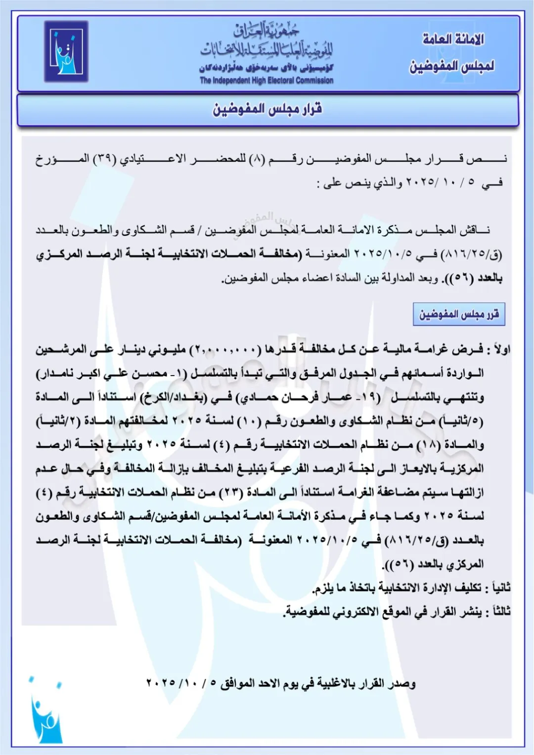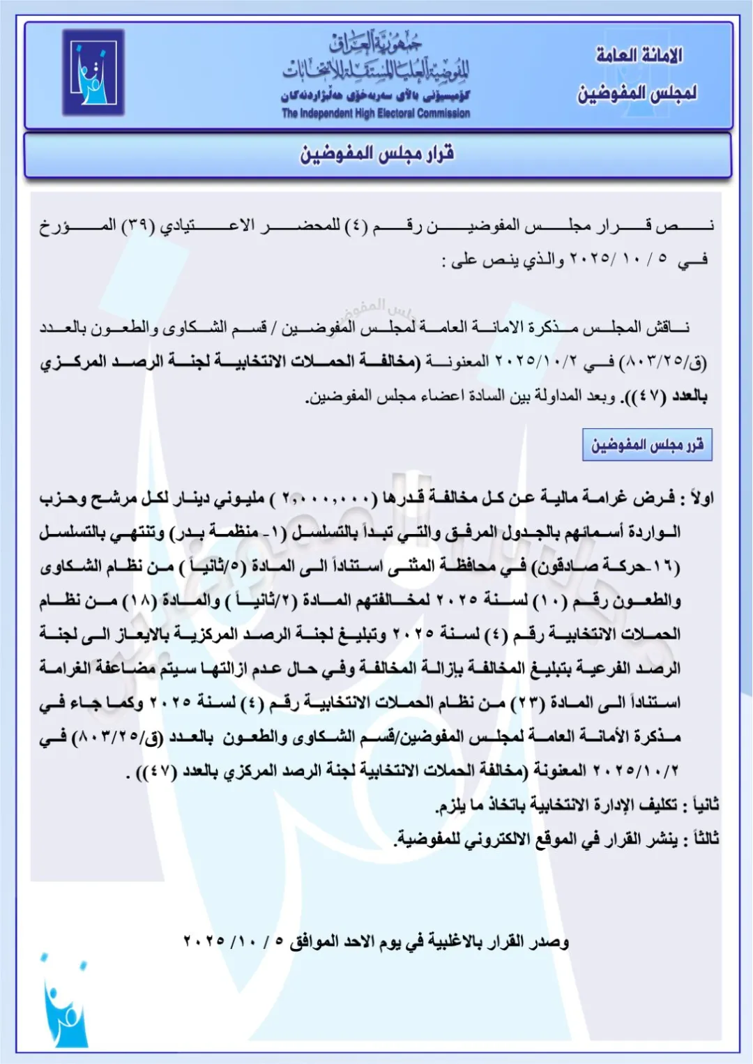 كما تضمنت الوثائق، فرض غرامات قدرها مليوني دينار عراقي، على مجموعة من قوائم المرشحين والأحزاب، لمخالفتهم نظام الحملات الانتخابية .