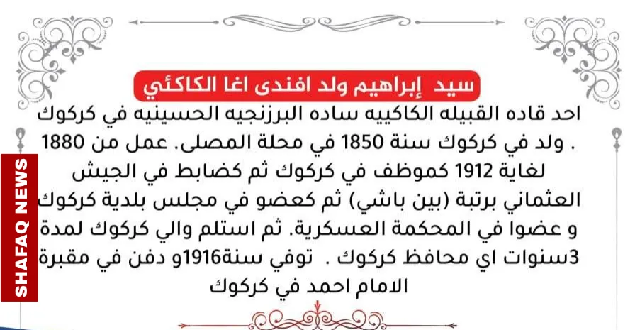 وقال الكاكائي، لوكالة شفق نيوز، إن "للكاكائيين في العراق مقابر خاصة بهم، وهم سادة ينحدرون من نسل الحسين (ثالث الأئمة) لدى الشيعة الإثنى عشرية، وي كركوك ينتمون إلى عشيرة الكاكائيين (الأغوات) وهم أبرز شيوخ الكاكائيين على مستوى العراق".