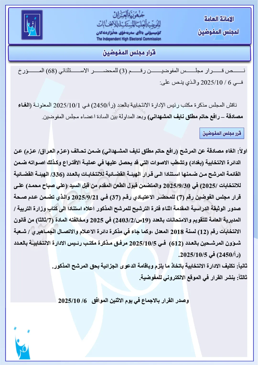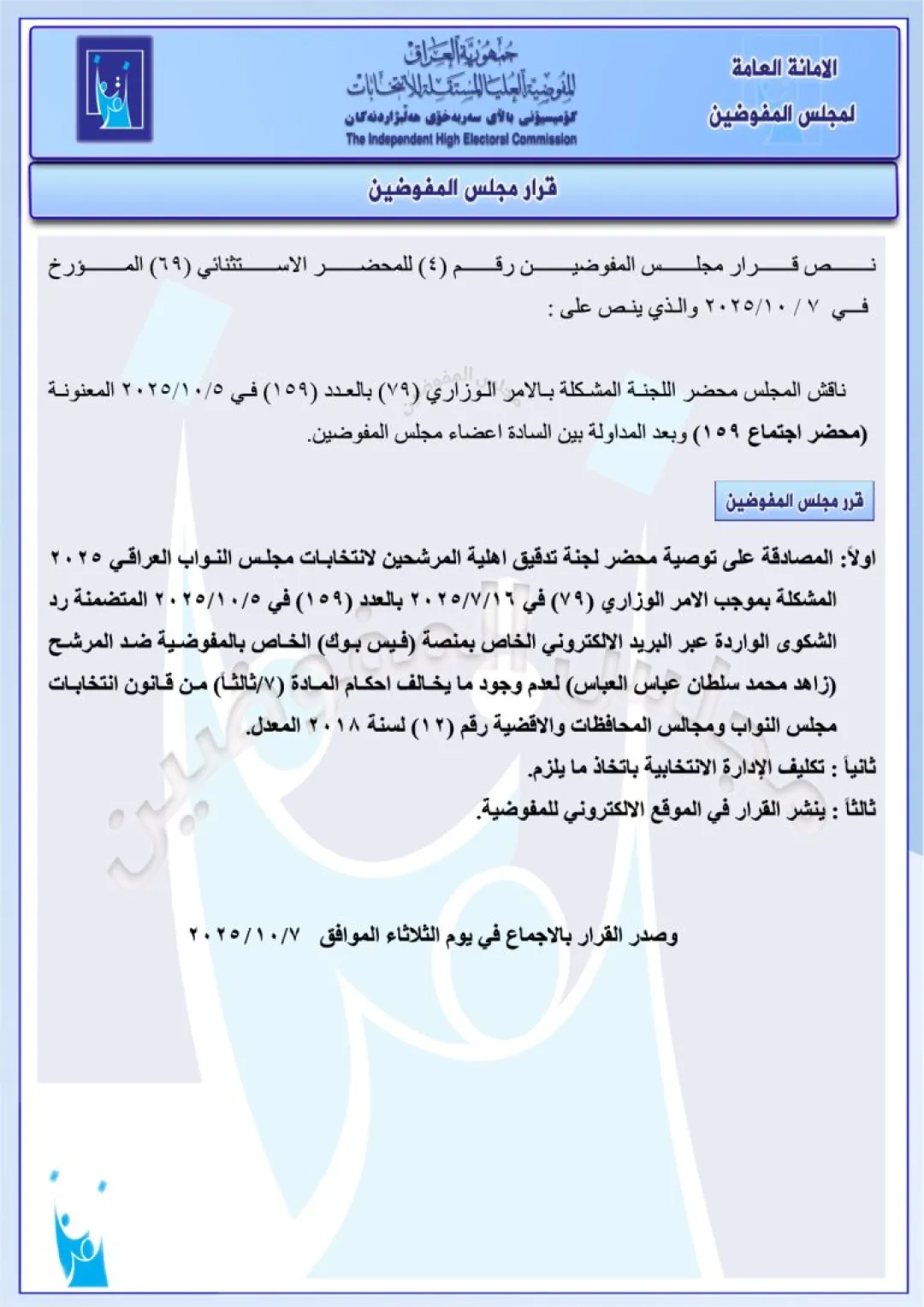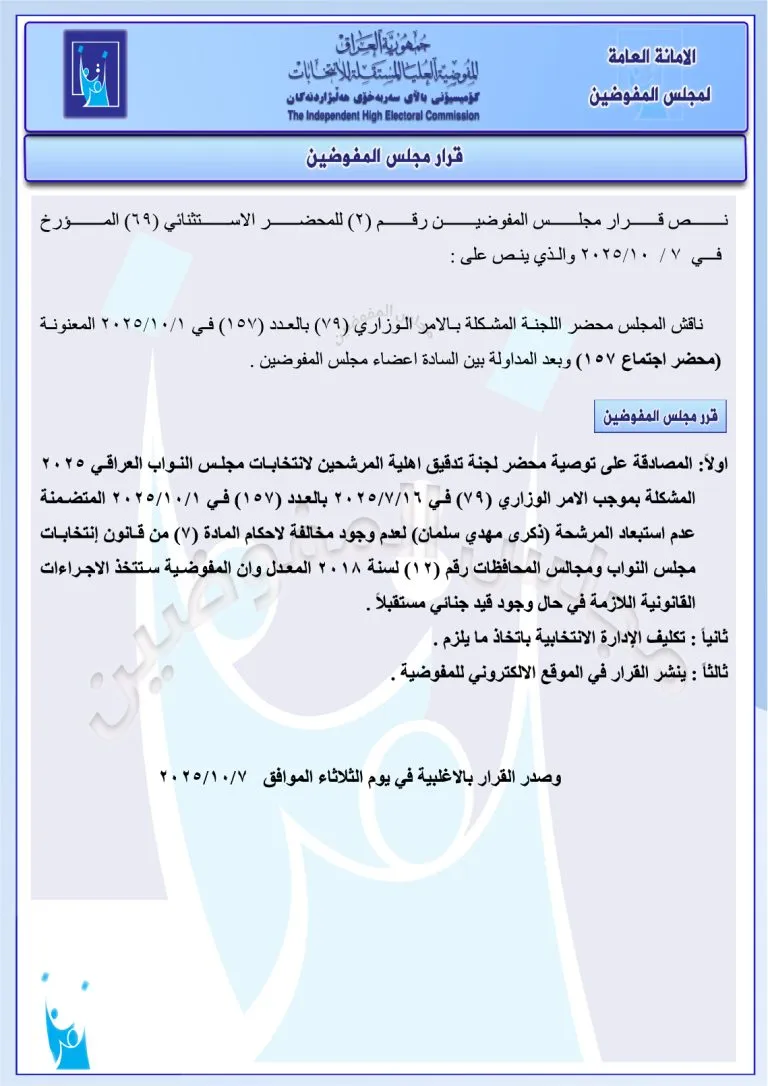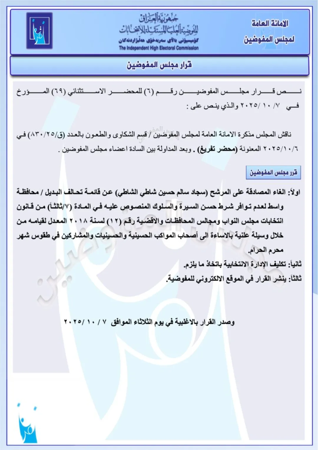 أعلنت مفوضية الانتخابات، اليوم الثلاثاء، إصدار مجلس المفوضين قرارات جديدة تتضمن إلغاء المصادقة على ترشيح النائب سجاد سالم لعدم توافر شرط حسن السيرة والسلوك، مع إلغاء المصادقة على مرشح آخر واستبعاد مرشحة ثالثة .