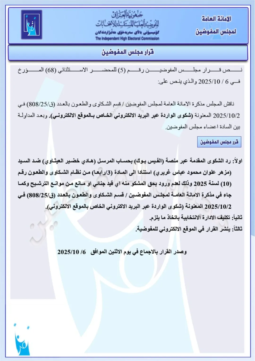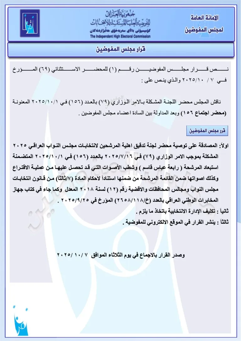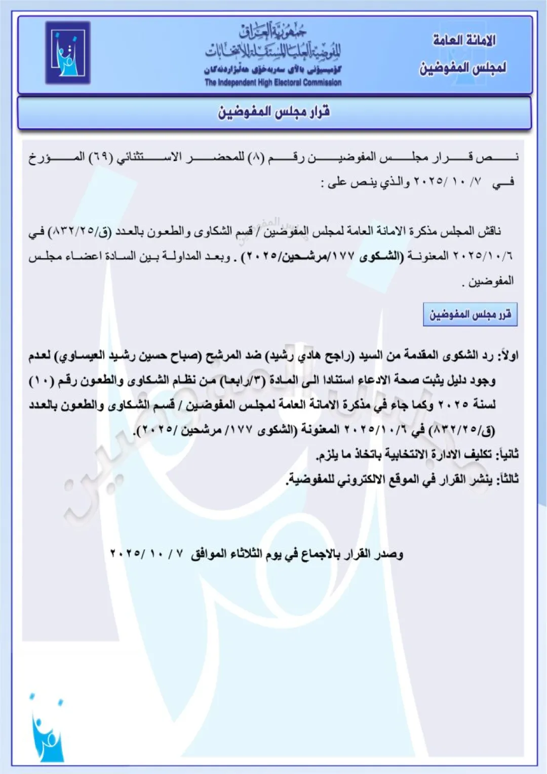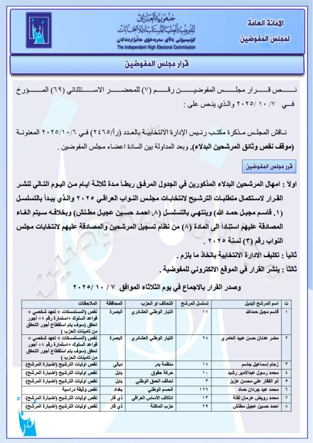 أعلنت مفوضية الانتخابات، اليوم الثلاثاء، إصدار مجلس المفوضين قرارات جديدة تتضمن إلغاء المصادقة على ترشيح النائب سجاد سالم لعدم توافر شرط حسن السيرة والسلوك، مع إلغاء المصادقة على مرشح آخر واستبعاد مرشحة ثالثة .