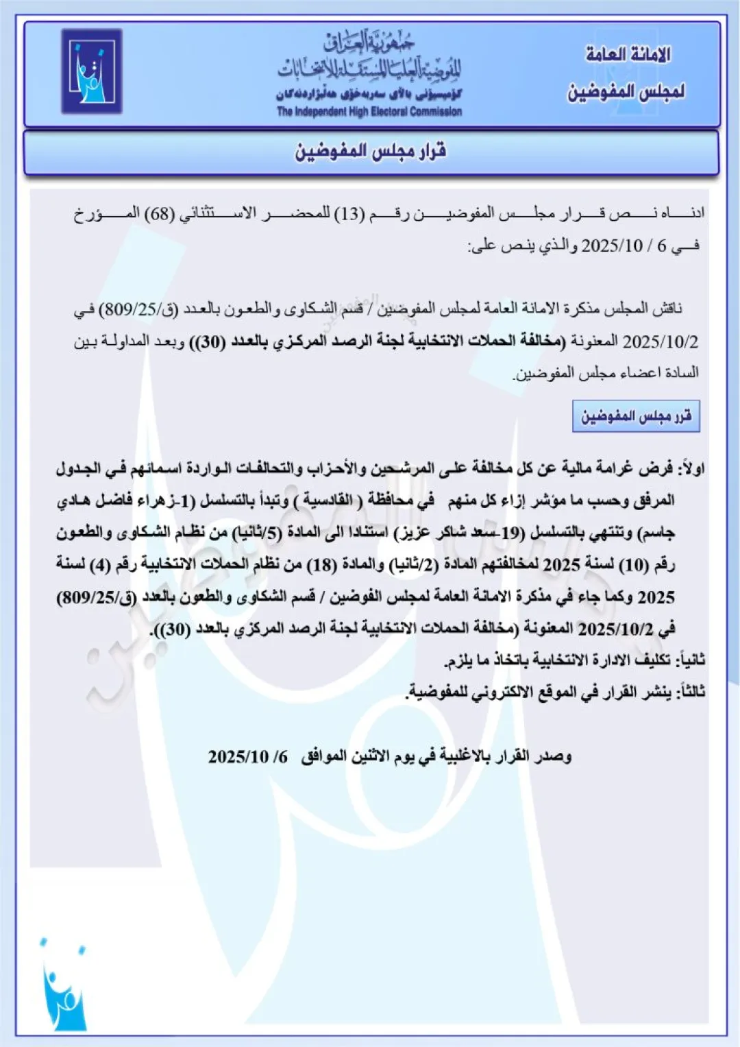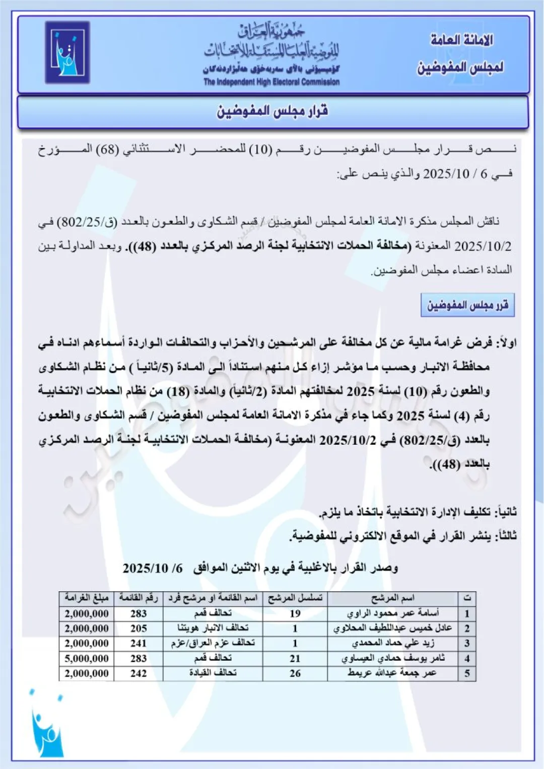 ووفقاً لوثائق صادرة عن مجلس المفوضين في يومي السادس والسابع من شهر تشرين الأول الحالي، تم فرض غرامات بحق80 مرشحاً من بينهم رؤساء تحالفات، لمخالفتهم أنظمة الحملات الانتخابية في أكبر قائمة من الغرامات تصدر عن المجلس منذ بدء فرض الغرامات على المخالفين .