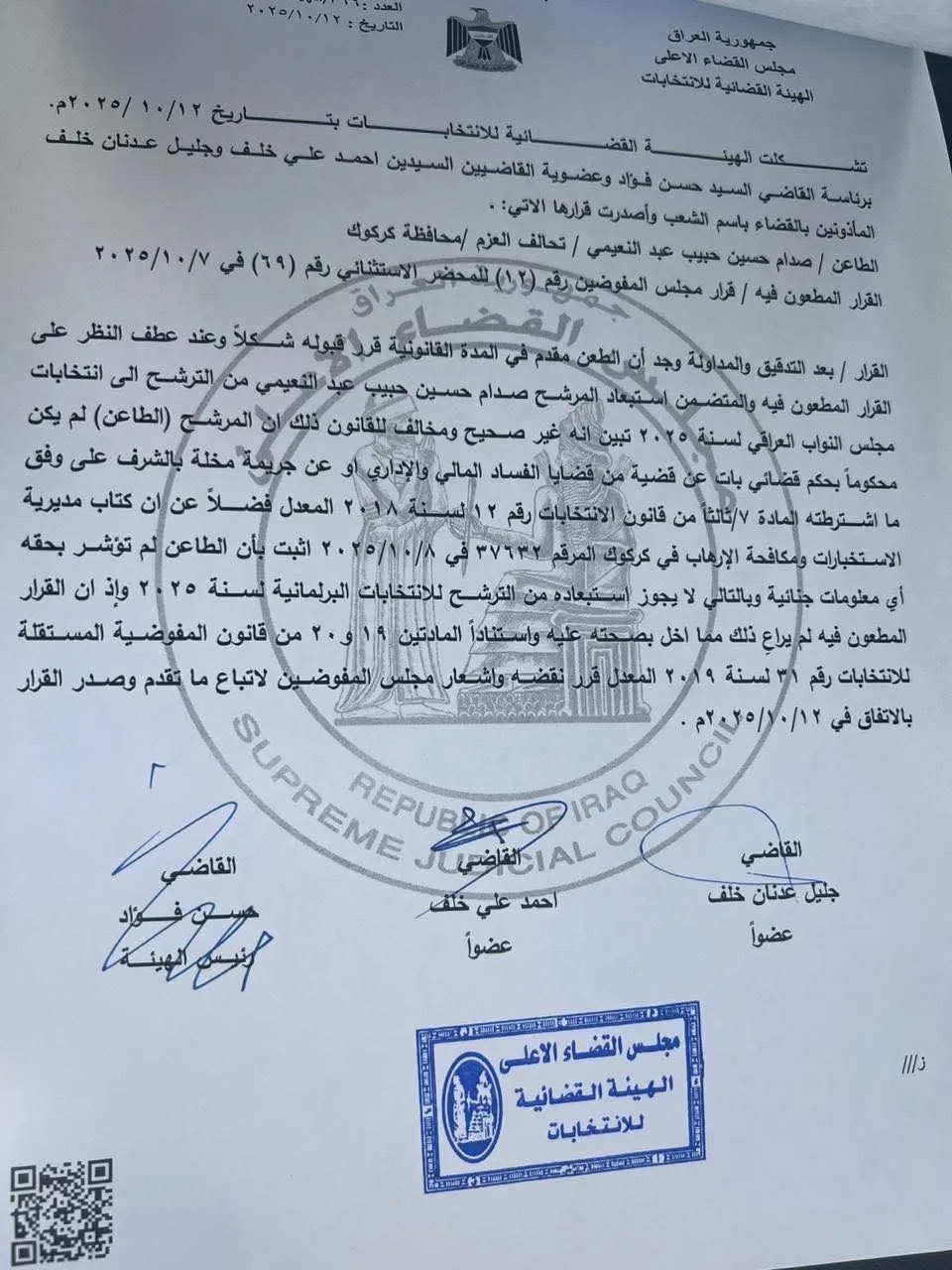 وجاء في القرار الصادر عن الهيئة القضائية للانتخابات، برئاسة القاضي فؤاد حسن فؤاد وعضوية القاضيين أحمد علي خلف وجليل عدنان خلف، أنها بعد التدقيق والمداولة القانونية رأت أن قرار مجلس المفوضين المرقم (69) في 10 تشرين الأول 2025 خالف أحكام القانون والتعليمات النافذة، الأمر الذي استوجب نقضه وإعادة النظر فيه.